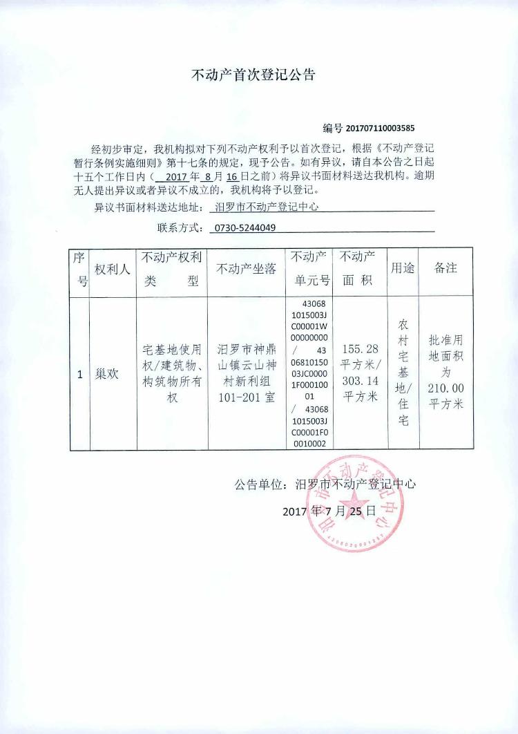 不动产首次登记公告(巢欢)