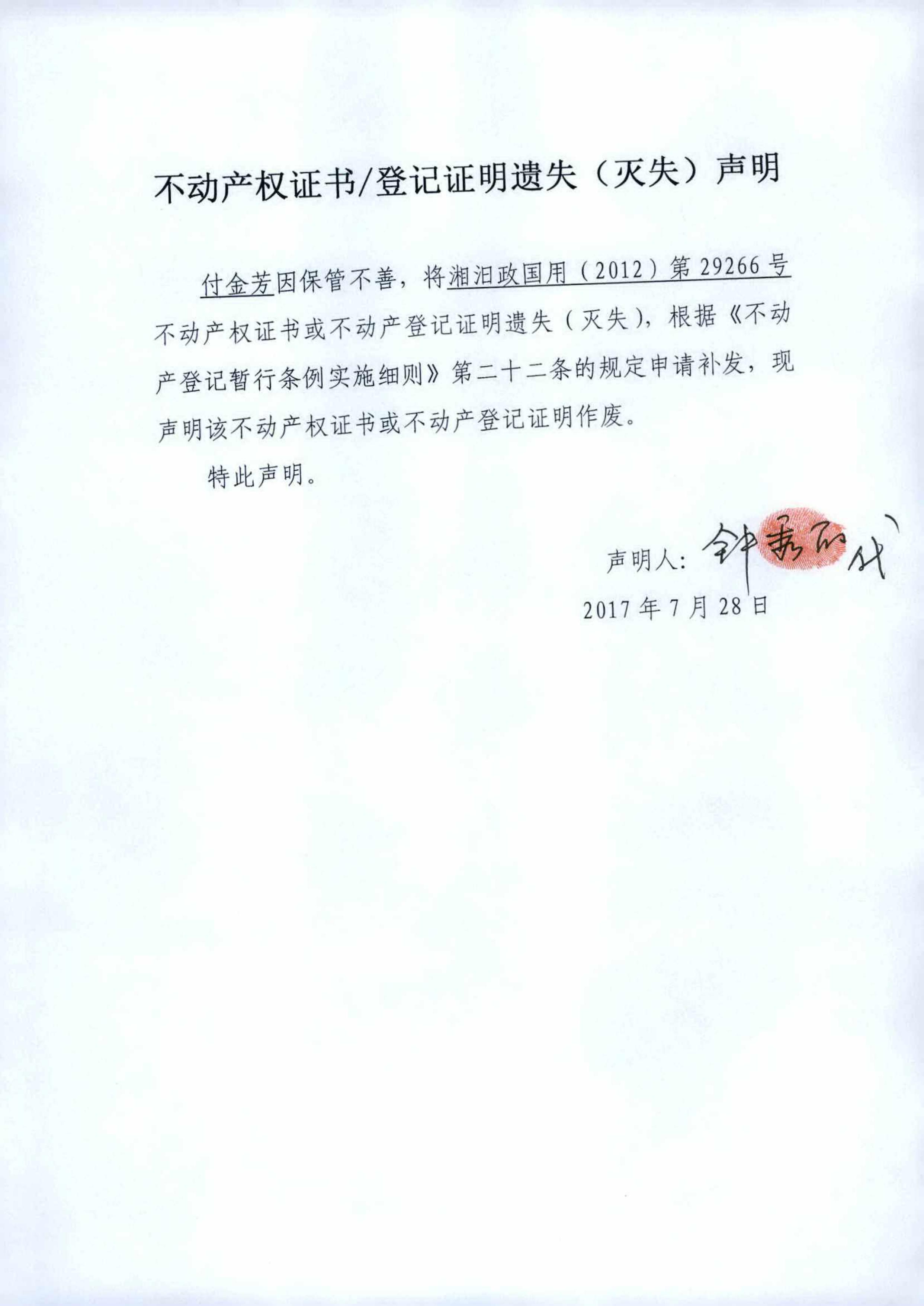 不动产权证书遗失声明(付金芳)