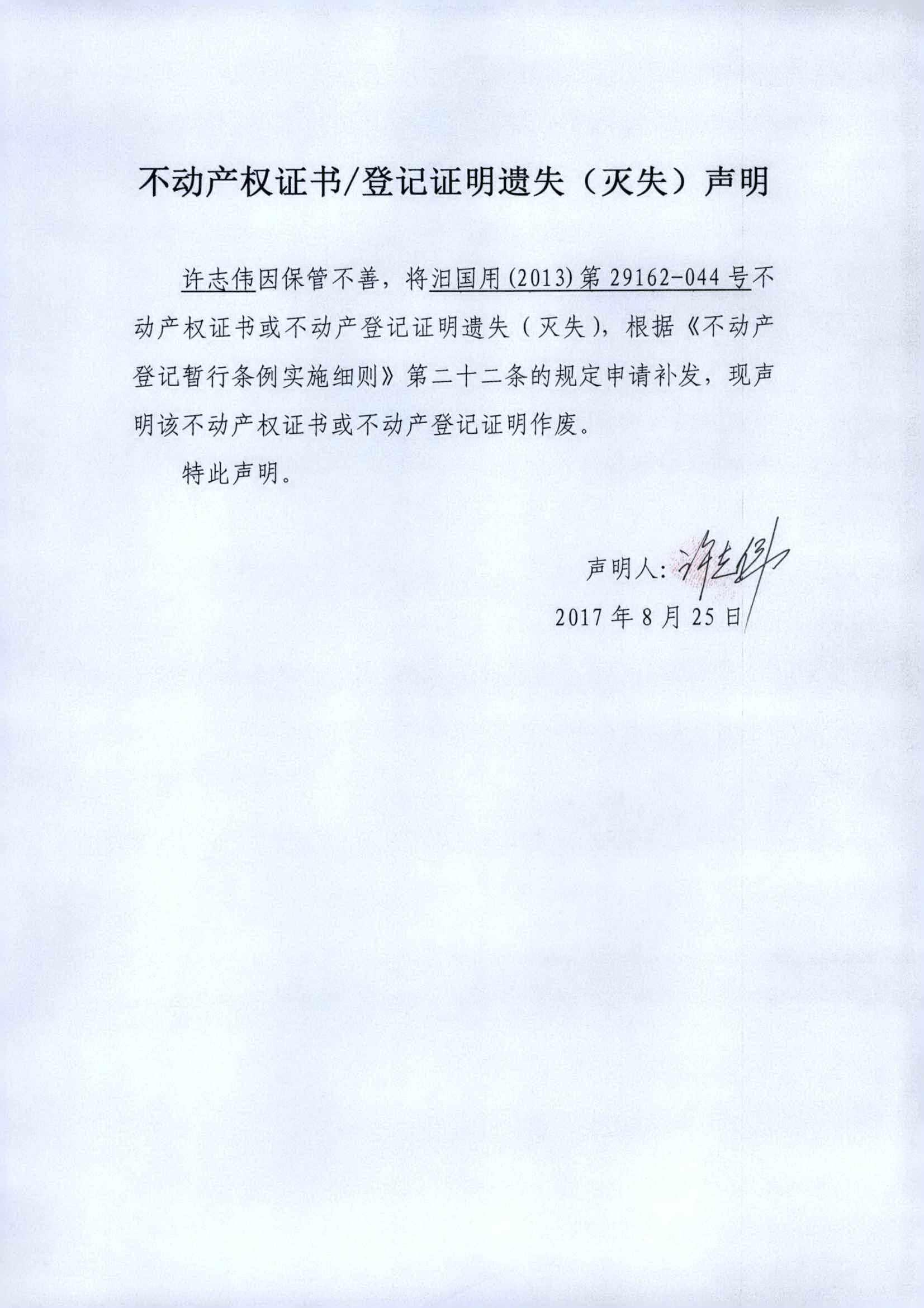 不动产权证书遗失声明(许志伟)