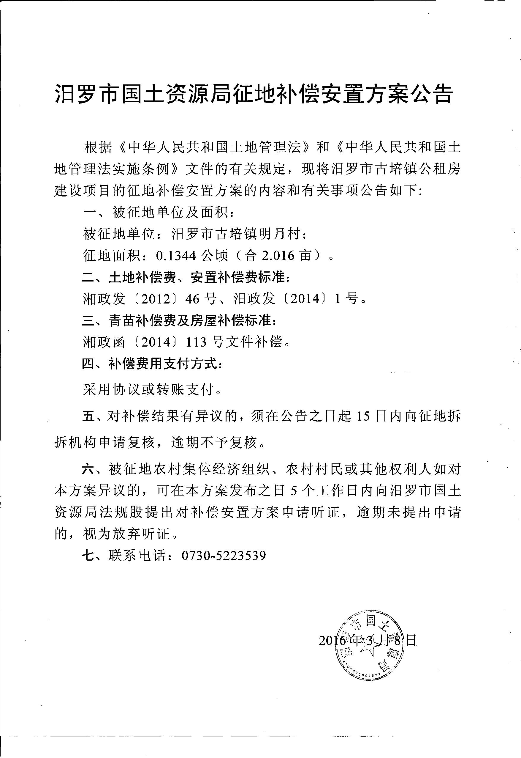 汨罗市国土资源局征地补偿安置方案公告(古培镇明月村)