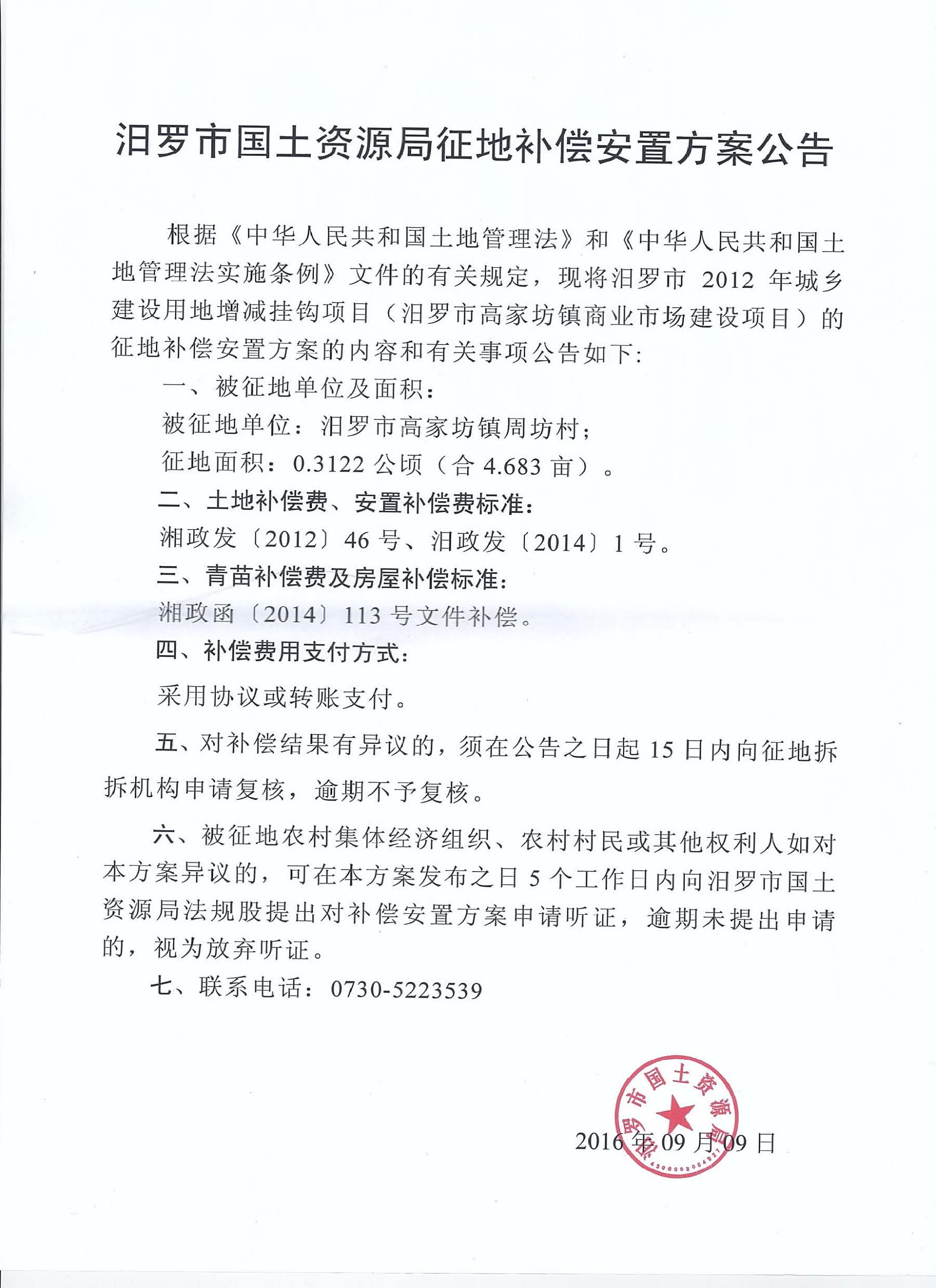 汨罗市国土资源局征地补偿安置方案公告(高家坊镇周坊村)