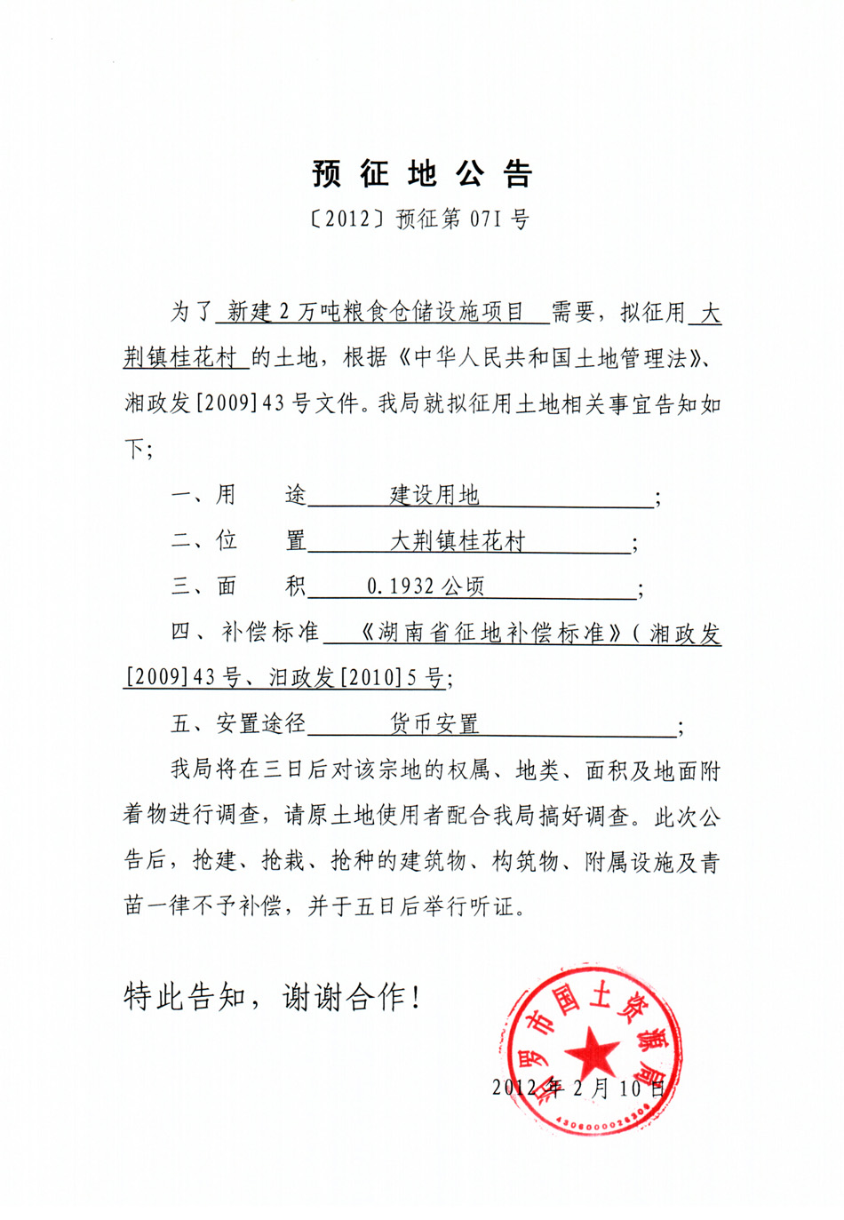 新建2万吨粮食仓储设施项目拟征地补偿公告1