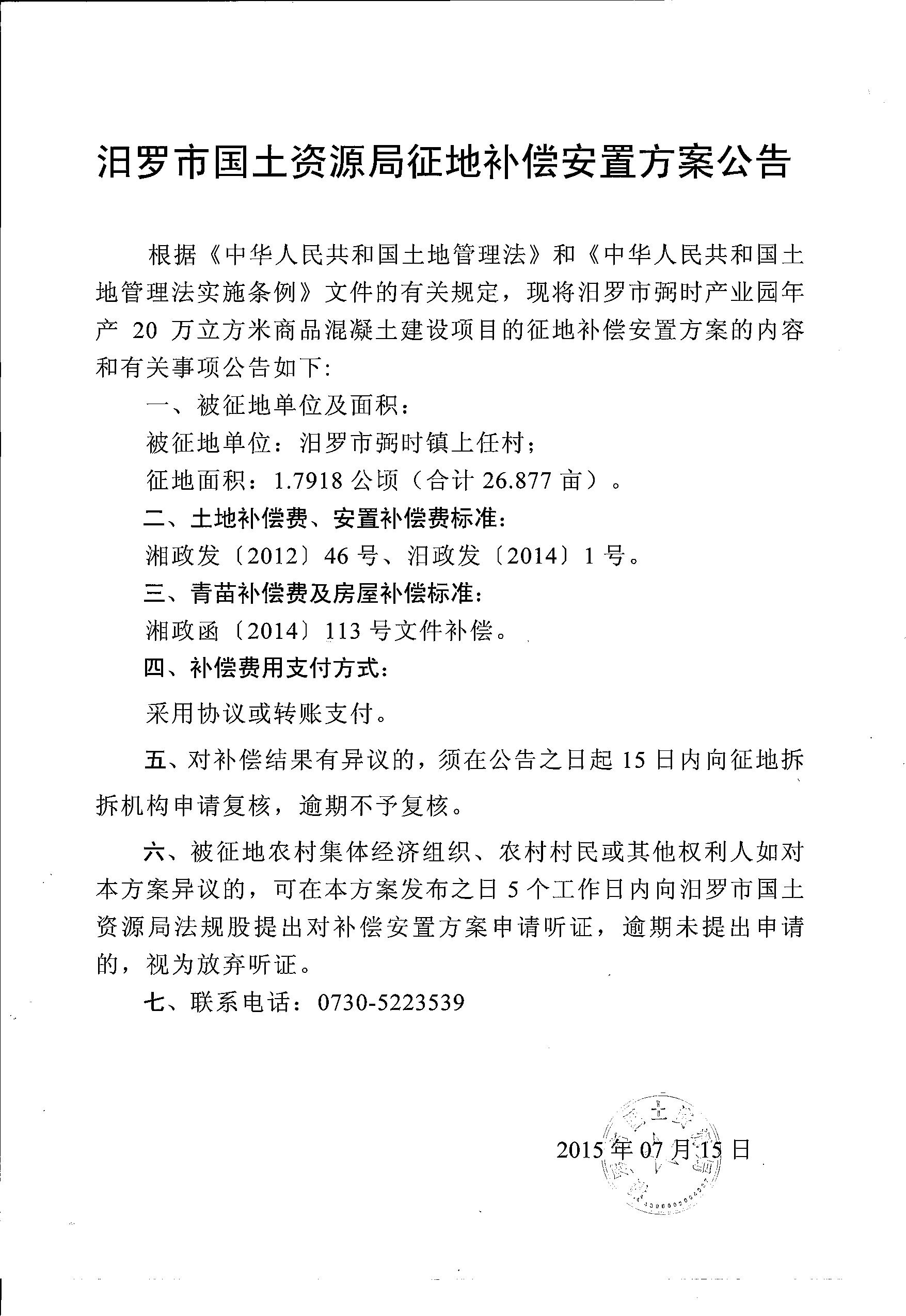 汨罗市国土资源局征地补偿安置方案公告