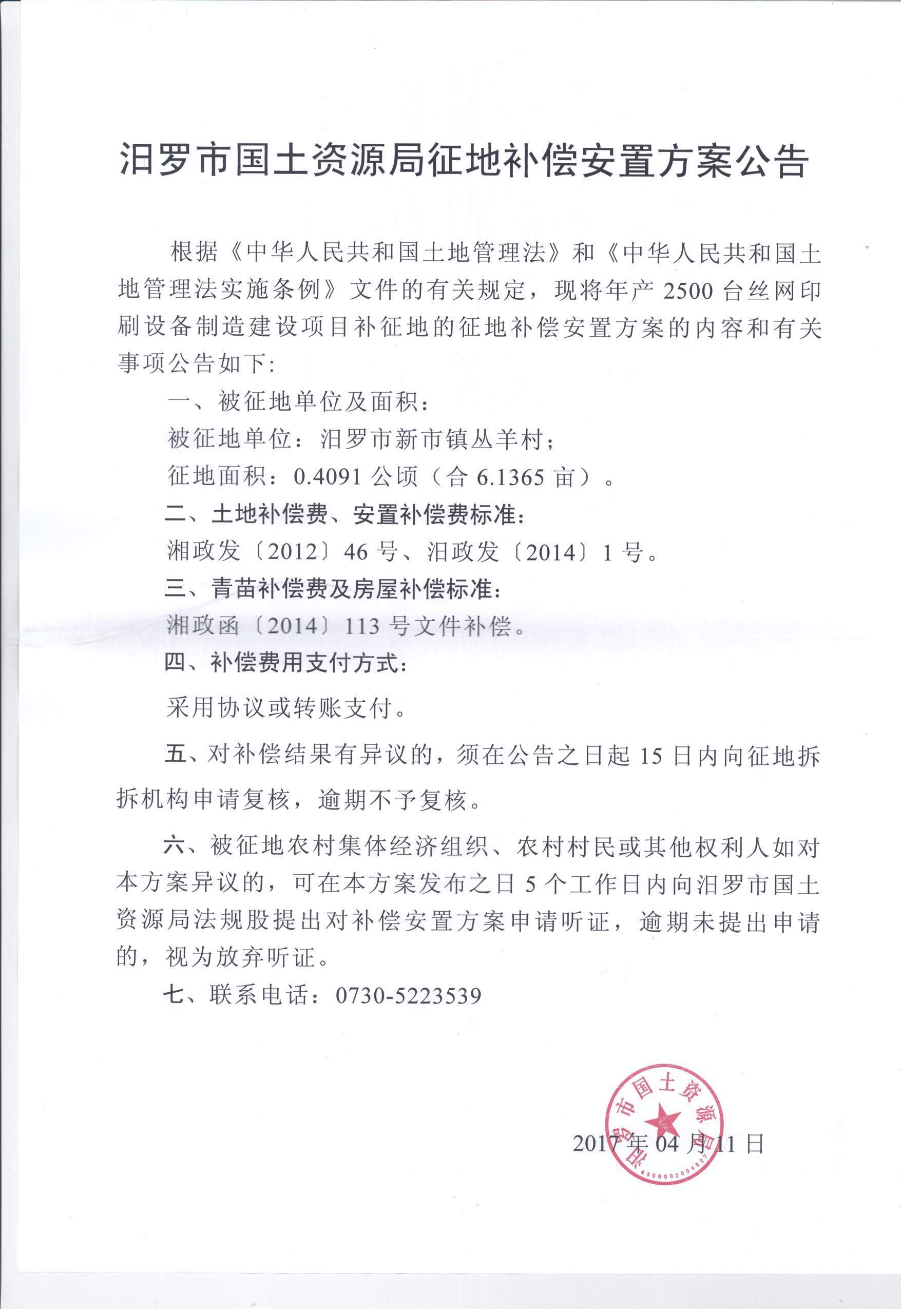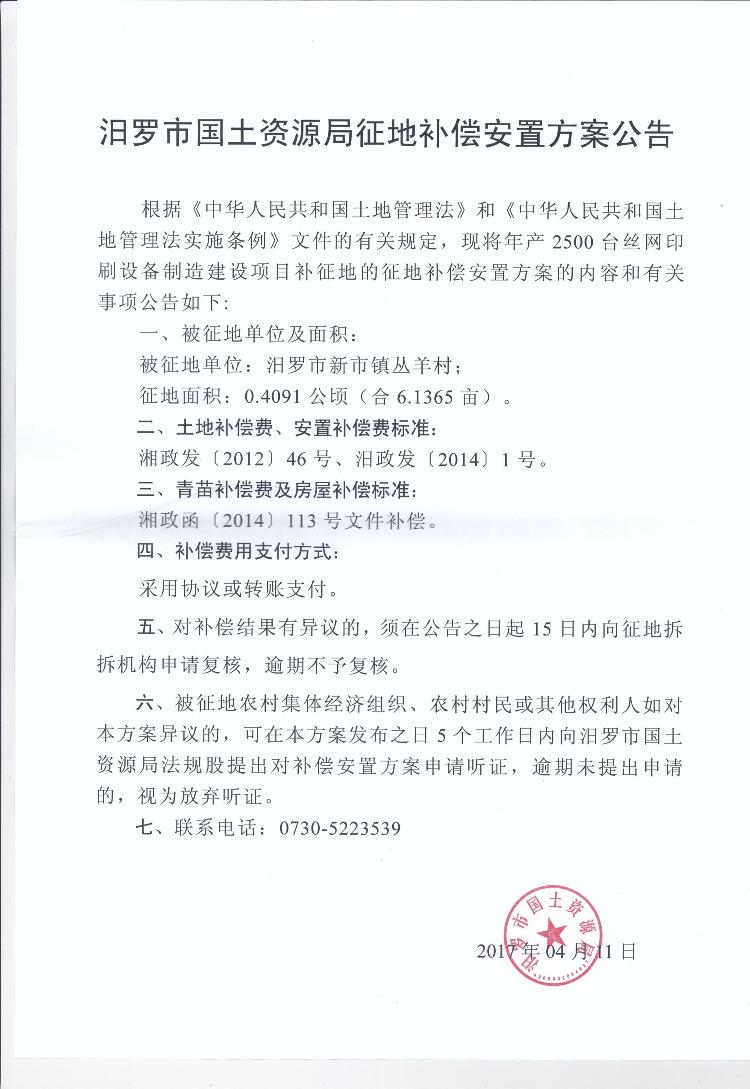汨罗市国土资源局征地补偿安置方案公告(汨罗市新市镇丛羊村)