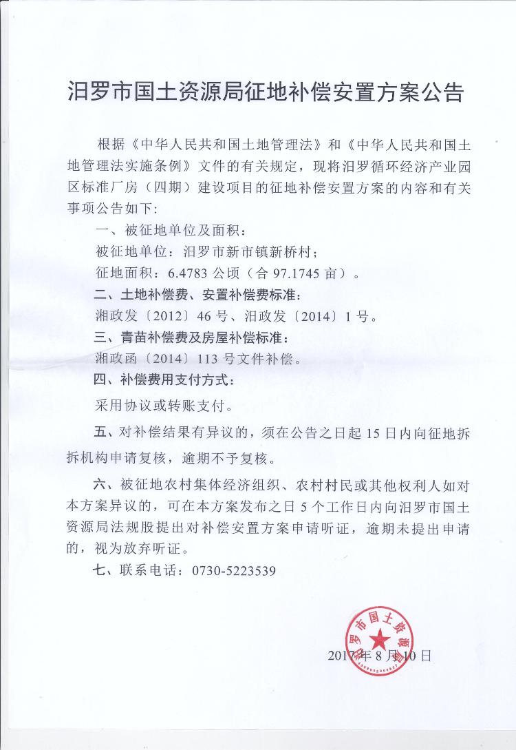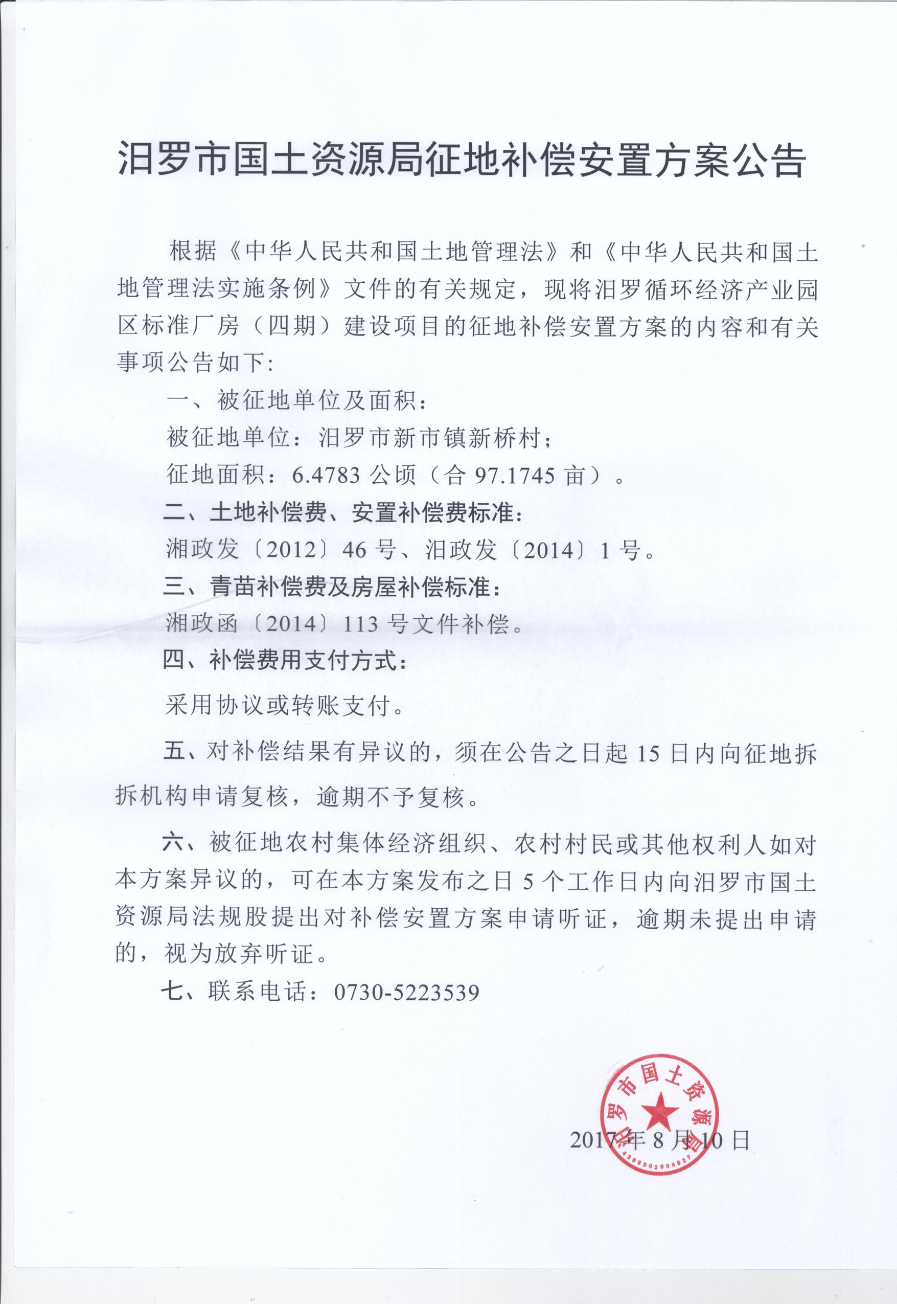 汨罗市国土资源局征地补偿安置方案公告(汨罗市新市镇新桥村)