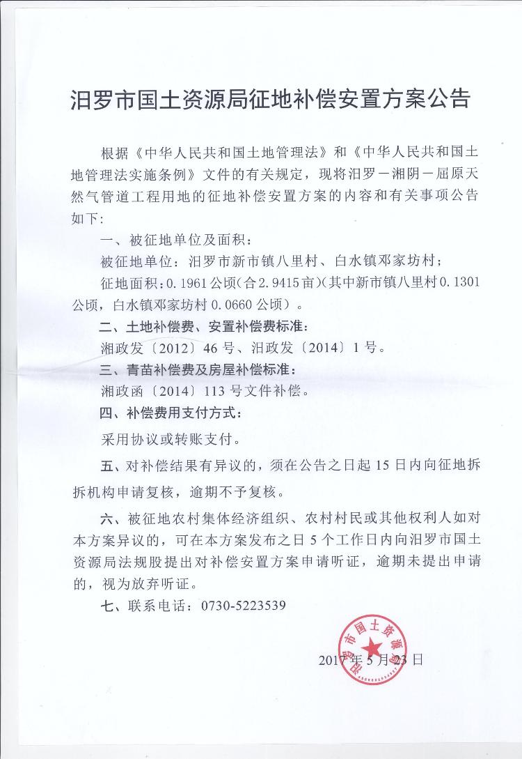 汨罗市国土资源局征地补偿安置方案公告(汨罗市新市镇八里村、白水镇邓家坊村)