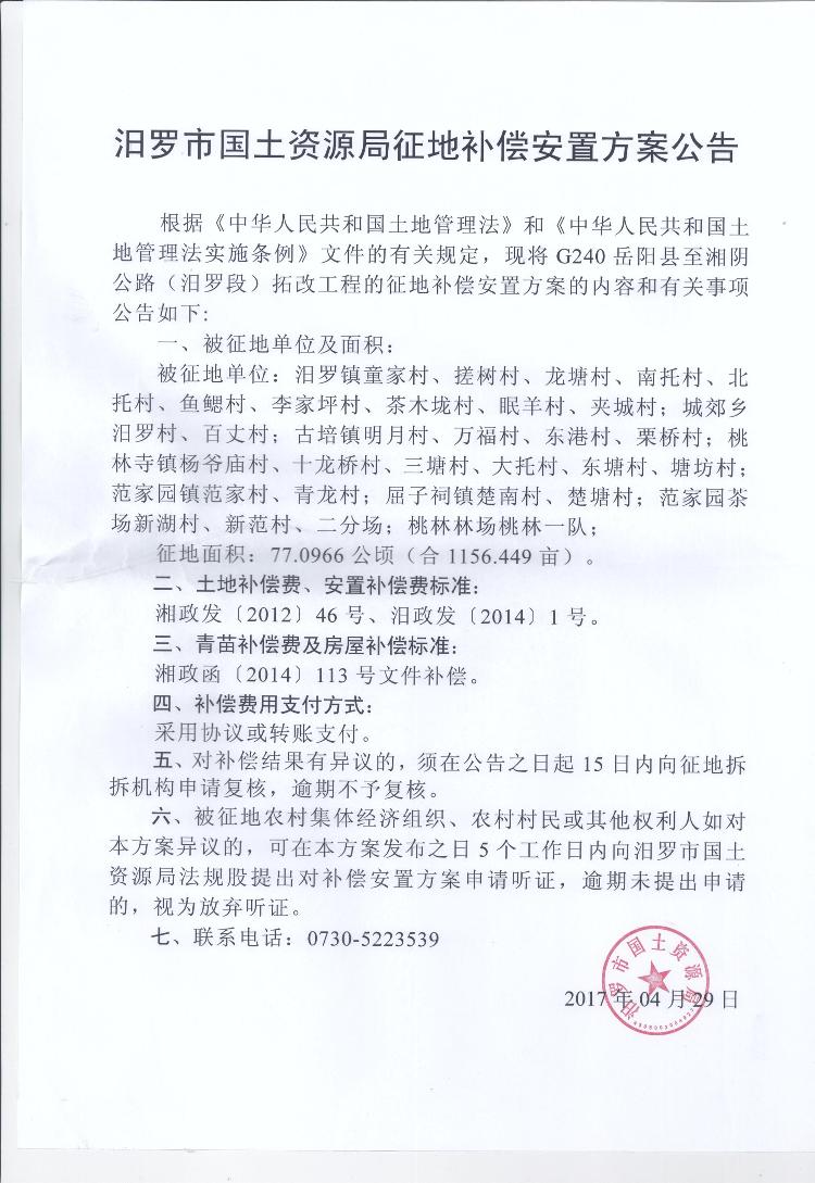 汨罗市国土资源局征地补偿安置方案公告(G240汨罗段)