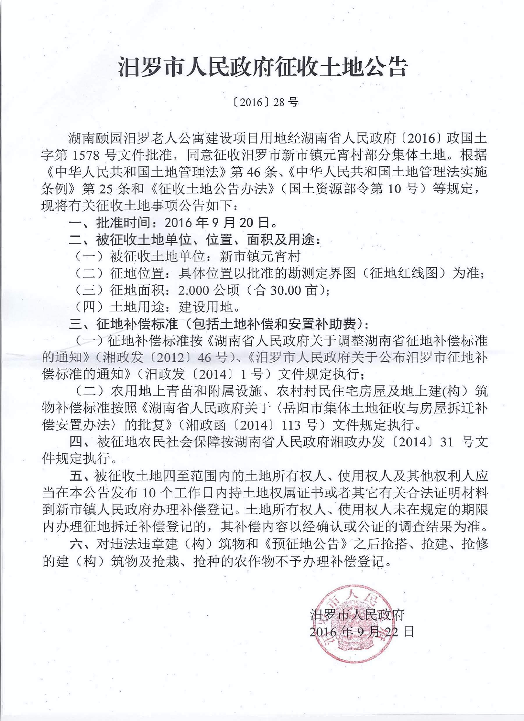 汨罗市人民政府征收土地公告【2016】28号