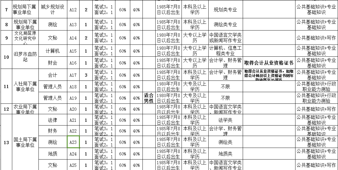 (五)岗位、年龄、学历、专业和其他要求见附表。详情请查询岳阳市人力资源和社会保障公共服务网、中国汨罗网、汨罗市政府门户网、汨罗市人力资源社会保障公共服务网。