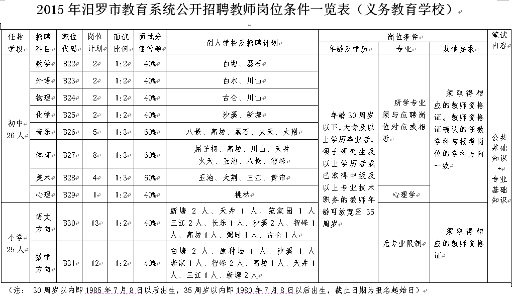 汨罗市2015年教育系统公开招聘教师岗位条件表.doc