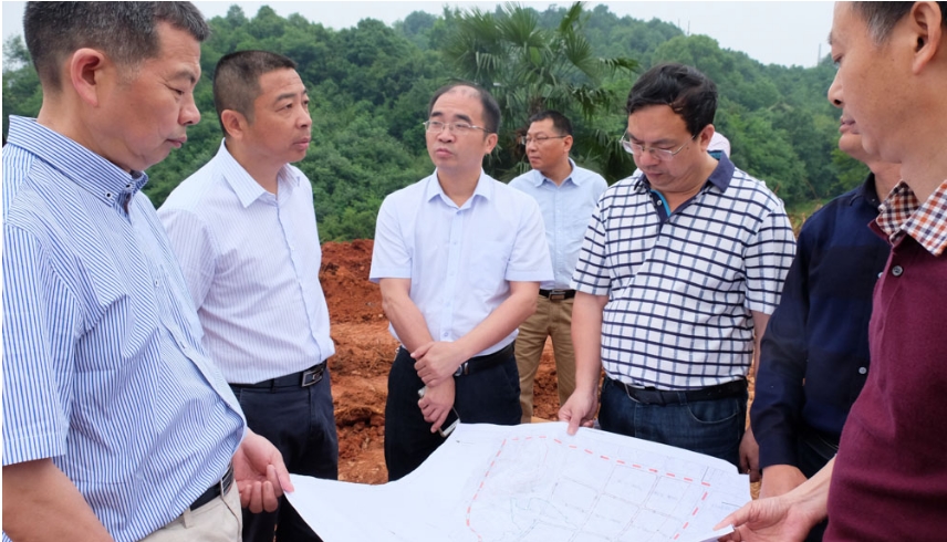 朱平波(左二)在循环经济产业园再生材料新园规划拟用地块现场调研