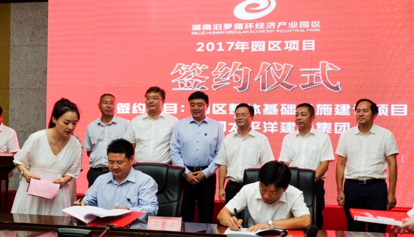 8月11日,汨罗循环经济产业园区招商项目集中签约仪式在汨罗江大酒店举行,涵盖再生资源加工、无人机、电气、光伏发电、基础设施建设等行业的八大项目进驻园区。市领导喻文、朱平波、闵秀明、彭千红、林治学、吴高明、宋辉等参加签约仪式。