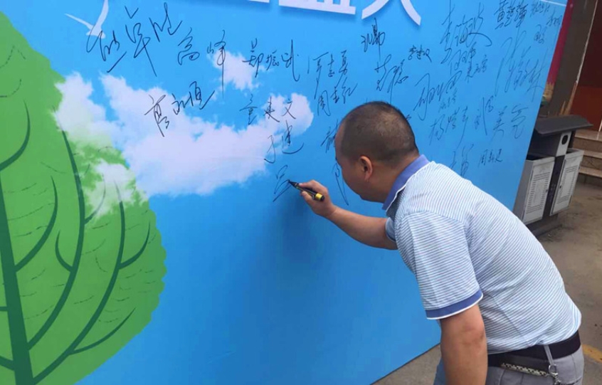 参与人员在“节能降耗,保卫蓝天”的主题背景墙上签下了自己的大名,响应节能倡议。