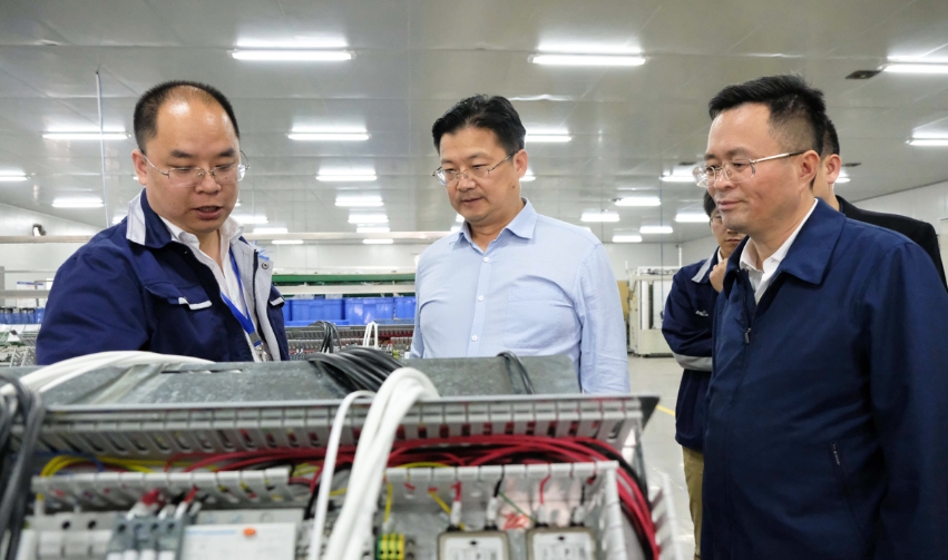 陈爱林(中)实地调研三兴精密生产车间。喻文(右一)参加