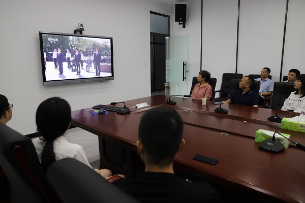 铭记历史,珍爱和平。9月3日,是中国人民抗日战争胜利暨世界反法西斯战争胜利75周年。一早,园区各部门的部门代表们来到会议室,等待集中观看直播仪式,园区纪工委书记杨惜春一同观看。