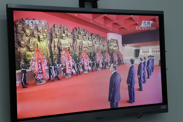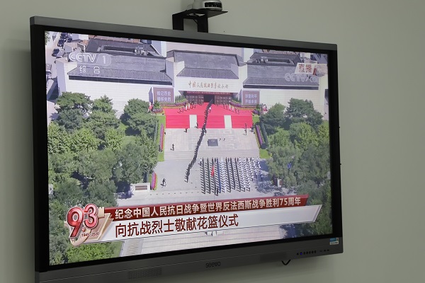 上午10点,仪式开始。在会议室,大家看得很投入、认真。电视中播放国家领导人习近平、李克强等人来到中国人民抗日战争纪念馆向英勇就义的抗日烈士表达哀思,敬献花篮。整个仪式过程庄严、肃穆,直播仪式上还对抗日时期历史进行解说,仿佛带着人们回到了那段烽火连天的岁月。