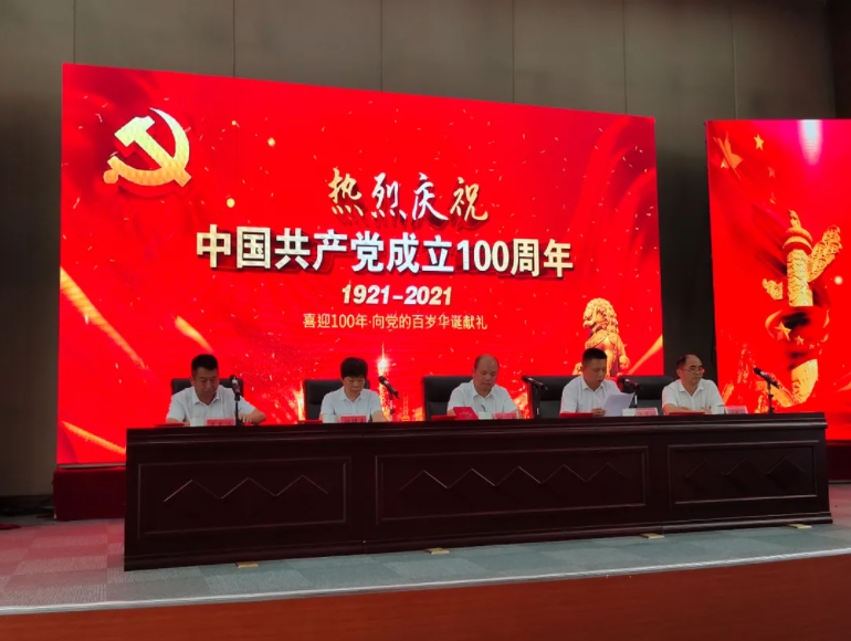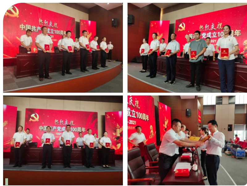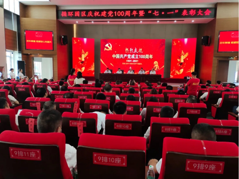 第二阶段庆祝中国共产党成立100周年大会,会议在国歌声中拉开帷幕,刘勇同志为湘达环保工程有限公司党支部老党员熊国富颁发“光荣在党50年”纪念章;杨惜春同志宣读先进基层党组织、优秀党务工作者、优秀共产党员奖励名单,其中湖南三兴精密股份有限公司党支部等2个支部荣获岳阳市委授予的先进基层党组织称号,张辉等3位同志荣获岳阳市委授予的优秀党务工作者称号,廖中良同志荣获岳阳市委授予的优秀共产党员称号,傅永革同志荣获汨罗市委授予的优秀党务工作者称号;园区经济发展部党支部等6个支部,邓艳娥等23名同志获得优秀共产党员称号;柳才平同志宣读了中共预备党员和转正党员名单通知,仇威等29位同志被批准为预备党员,仇果等17位同志按期转为正式党员。
