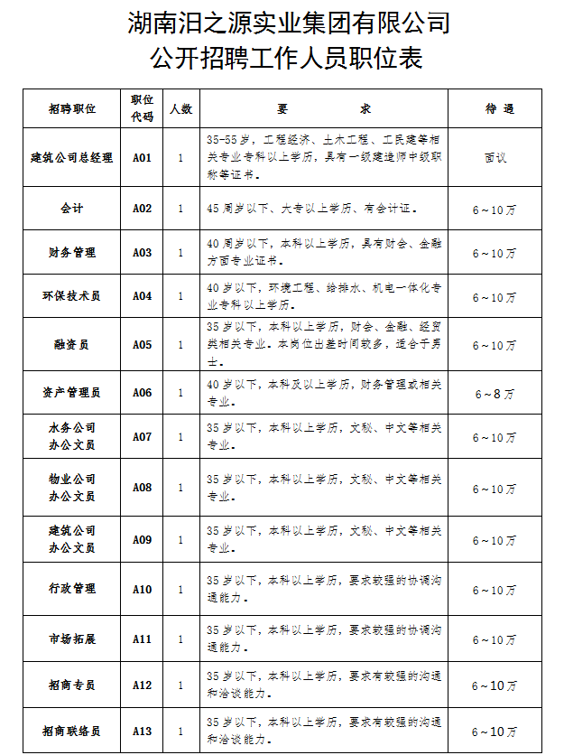 1、年龄、学历、专业等要求见附件《湖南汨之源实业集团有限公司公开招聘工作人员职位表》;