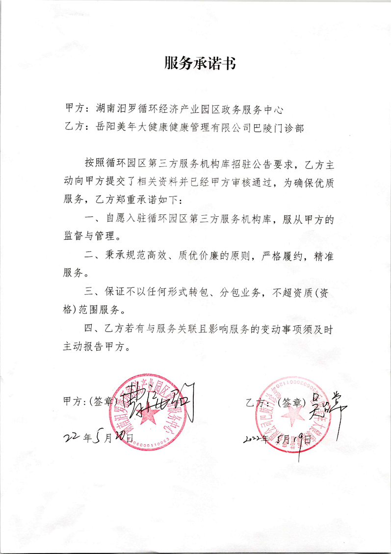 岳阳美年大健康健康管理有限公司巴陵门诊部服务承诺书