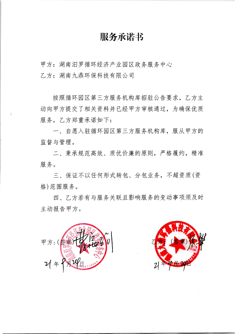 湖南九鼎环保科技有限公司服务承诺书