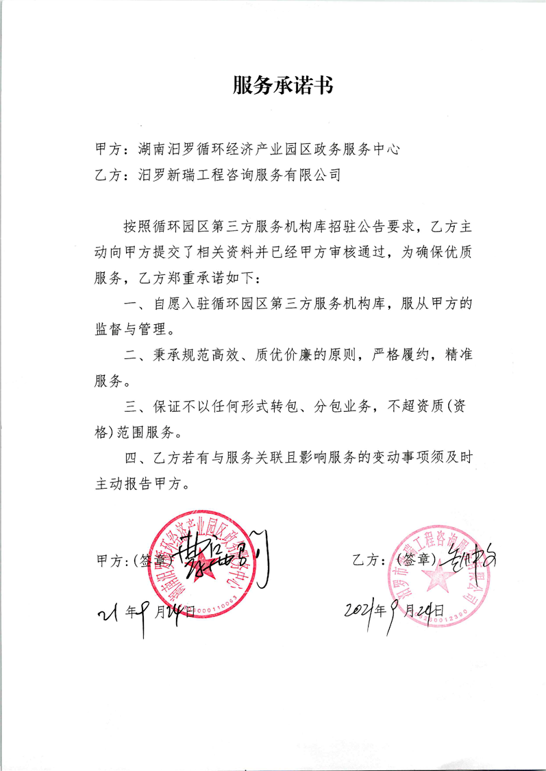 汨罗新瑞工程咨询服务有限公司服务承诺书