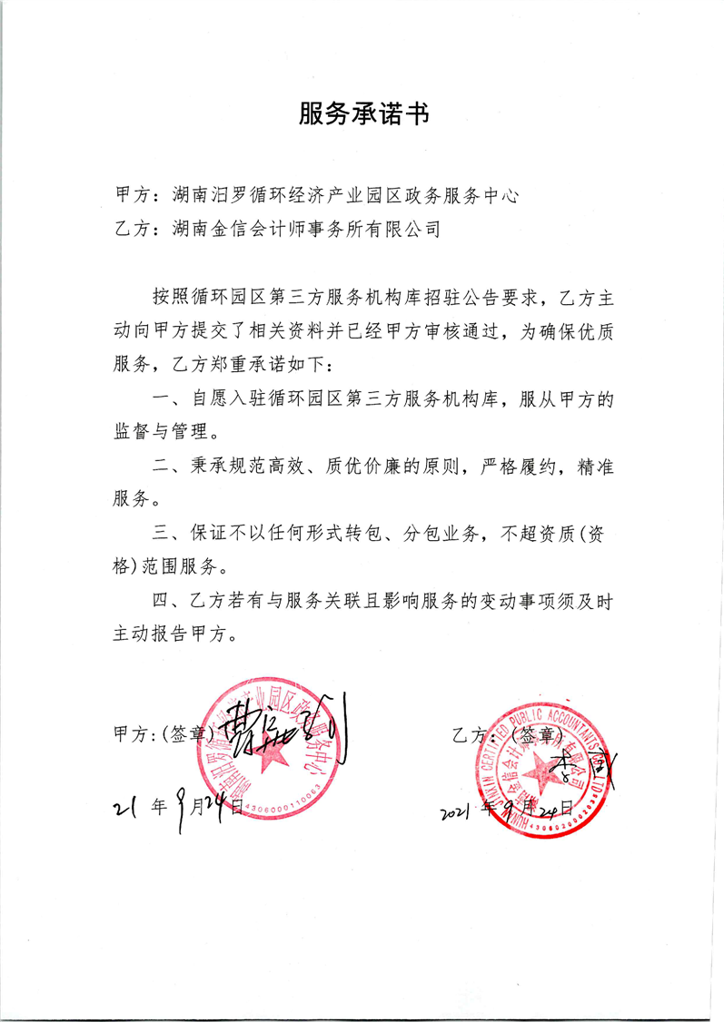 湖南金信会计师事务所有限公司服务承诺书