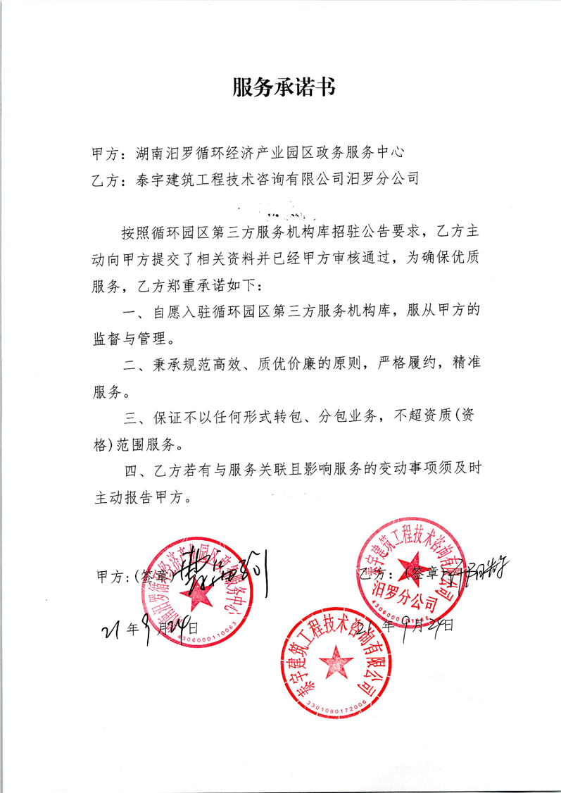 泰宇建筑工程技术咨询有限公司汨罗分公司服务承诺书
