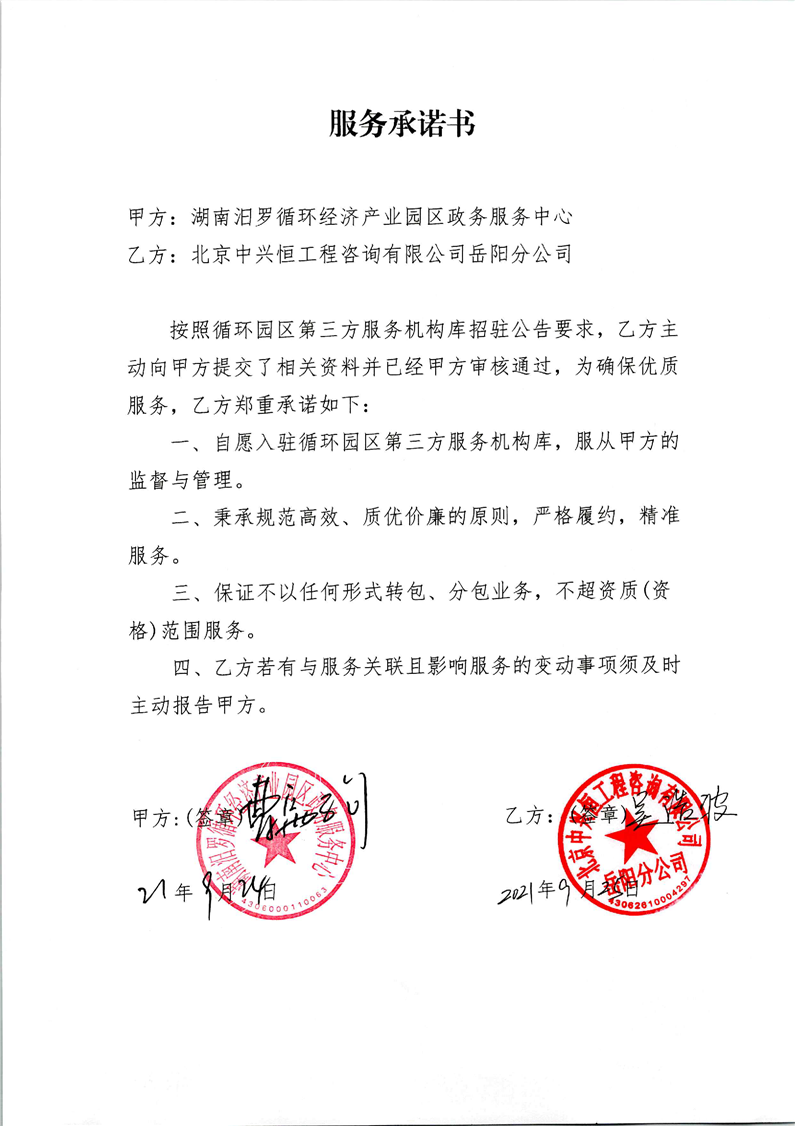 北京中兴恒工程咨询有限公司岳阳分公司服务承诺书