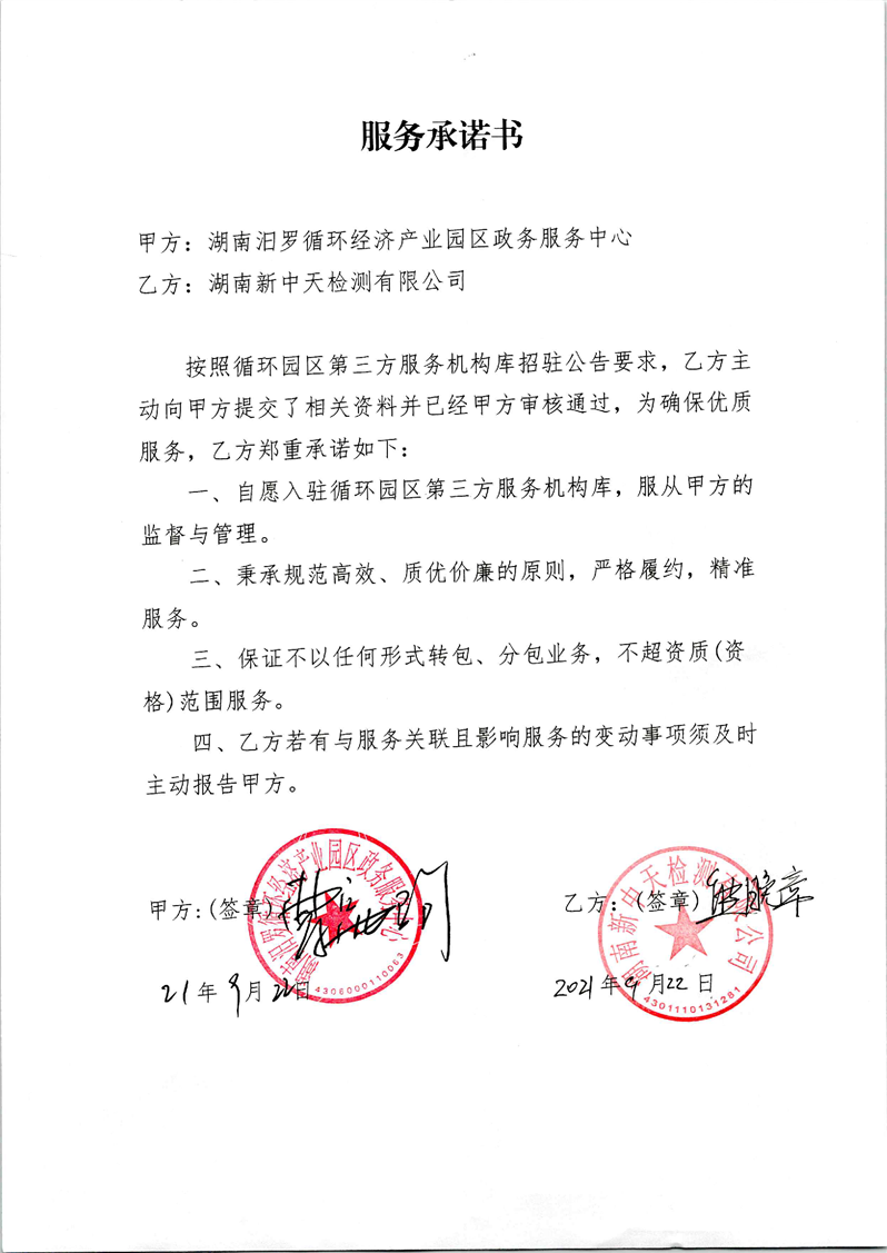 湖南新中天检测有限公司服务承诺书