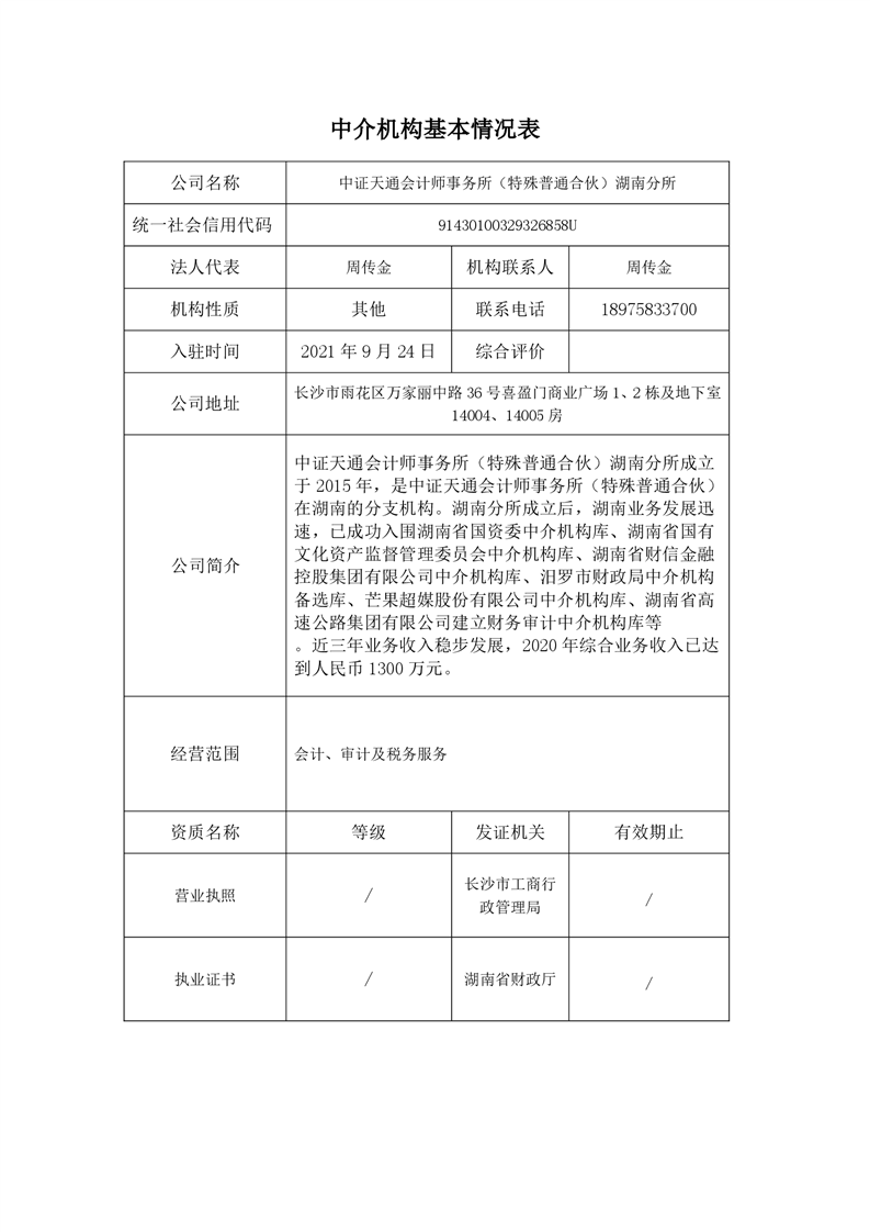 中证天通会计师事务所(特殊普通合伙)湖南分所