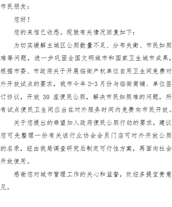 从新闻上得知,岳阳有在弄便民公厕,已经有30多个点了。 我们是岳阳市房地产经纪行业协会(筹),有会员单位30多家,遍布全城的门店80余家,我们的会员,一直积极承担社会责任,一直对外免费提供厕所,充电,wifi等服务,见到便民公厕行动后,我们任务和我们的愿望完全一致,我们希望能够加入政府的便民公厕行动,服务更多市民,游客。 如果城管局打算继续扩展便民公厕,我们整个行业都希望能够共同为广大市民提供服务。 |