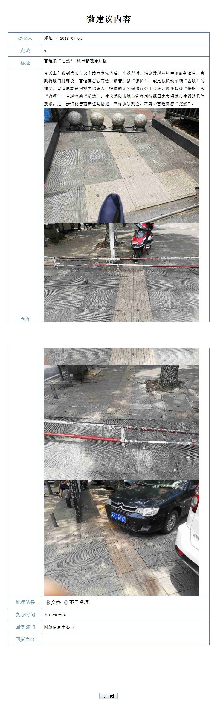 岳阳市政协委员邓峰(139****2801)通过省政协云APP反映:今天上午我到岳阳市火车站办事完毕后,在返程时,沿途发现从新中讯商务酒店一直到得胜门村路段,盲道存在被石墩、钢管加以“保护”,或是被机动车辆“占领”的情况。盲道原本是为视力障碍人士提供的无障碍通行公用设施,现在却被“保护”和“占领”,盲道深感“茫然”。建议岳阳市城市管理局按照国家文明城市建设的具体要求,进一步细化管理责任与措施,严格执法到位,不再让盲道深感“茫然”。