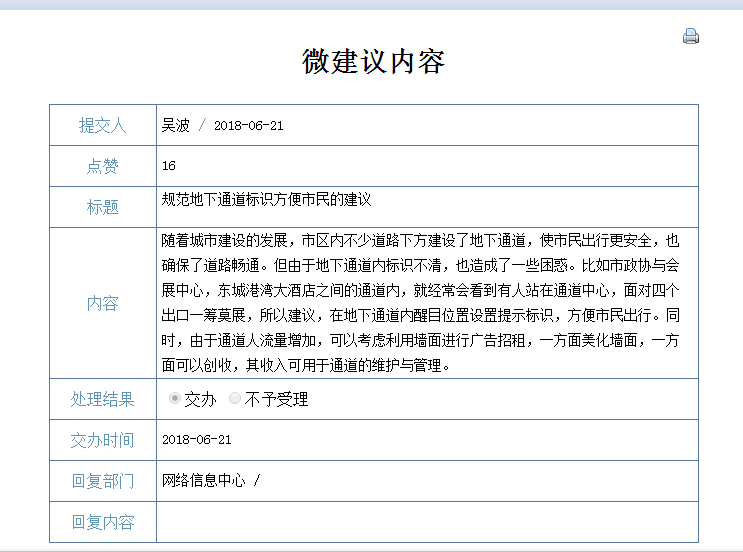 岳阳市政协委员吴波(139*******18)通过省政协云APP反映:随着城市建设的发展,市区内不少道路下方建设了地下通道,使市民出行更安全,也确保了道路畅通。但由于地下通道内标识不清,也造成了一些困惑。比如市政协与会展中心,东城港湾大酒店之间的通道内,就经常会看到有人站在通道中心,面对四个出口一筹莫展,所以建议,在地下通道内醒目位置设置提示标识,方便市民出行。同时,由于通道人流量增加,可以考虑利用墙面进行广告招租,一方面美化墙面,一方面可以创收,其收入可用于通道的维护与管理。 |