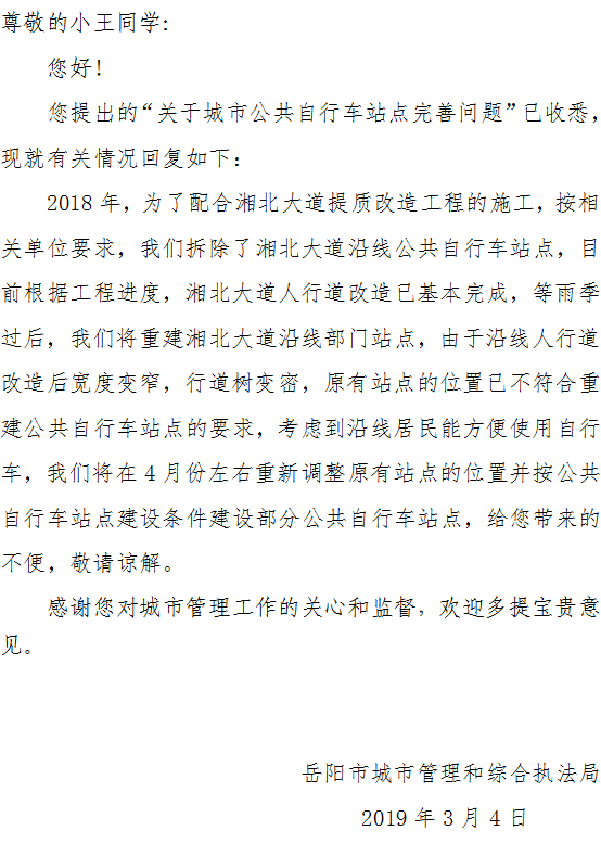 希望在湖南理工学院南院大门再新设置一个城市公共自行车站点。湖南理工学院附近现在只有“湖南理工学院行政楼”一个站点,但是因为学校人口密集,又靠近奇家岭街道,使用人员多,导致该站点经常无车可用,或者还车人太多而无法就近停车。(湖南理工学院南院大门原来有一个公共自行车站点,但因学院路提质改造而拆除了,现湘北大道已经完工,希望能恢复原有站点) |