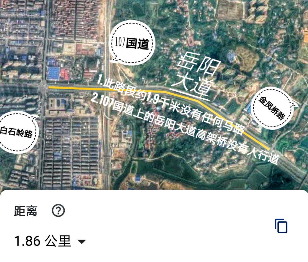 您好,来信收悉,现就您反映的问题回复如下: 连接线1至9公里范围非人口密集区,岳阳大道的白石岭路口和南翔万商立交车辆都可以掉头和行人横过马路,岳阳大道作为城市快速车道必须保证通行效率,不能因附近零星出行更改道路规划设计。如更改道路规划设计,建议市民向规划设计部门反映。感谢您对公安交通管理工作的关心和支持。谢谢!