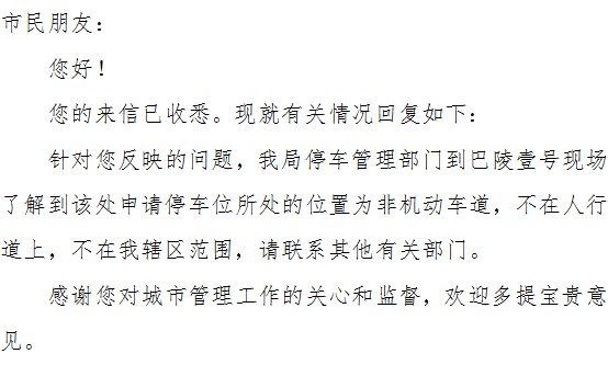 尊敬的市长: 您们好,分别位于岳阳楼区巴陵东路明星央城、巴陵壹号两个小区于2014年陆续业主入住,小区停车位明显不够用。巴陵壹号小区一楼就是华日汽车城、洛王社区办事处,明星央城一楼有银行、公积金管理局等公益性商务机构。随着岳阳的经济快速发展,华日汽车城商户的生意和往来的外部顾客也是越来越多,导致明星央城、巴陵壹号业主停车难问题日益严重。小区现有的停车位已满足不了小区车辆的停放,特向贵局申请停车位。 目前两小区设置地下停车位不足业主使用,尤其是业主夜间车辆停放难尤为突出。故向贵局申请在巴陵东路靠明星央城、巴陵壹号小区一侧路上申请40个公共停车位,希望贵市领导给予解决为盼。 此致! |