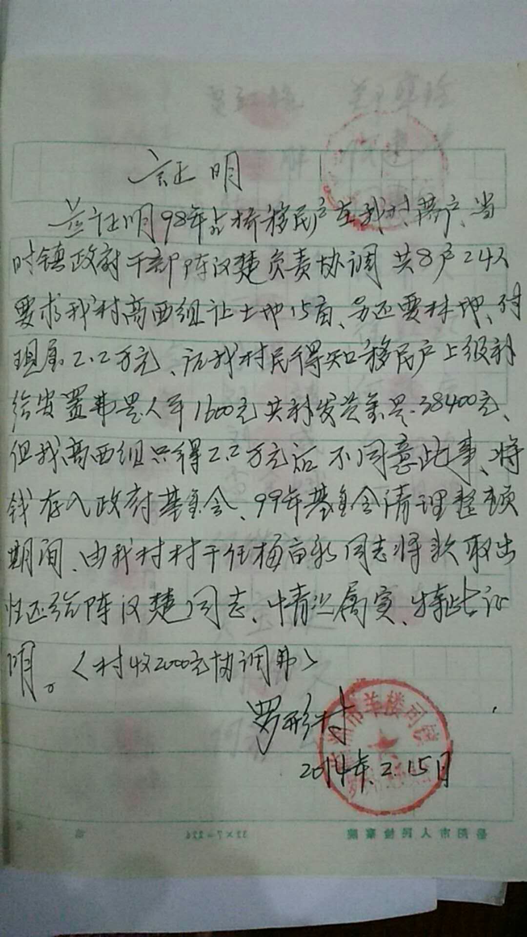 | 再次反馈: | 1998年,我们落户到羊楼司镇罗形村高西组,每人落户费为1600元,24人共计38400元。钱亲手交给镇干部陈汉楚手中,而陈只给罗形村2.2万元,挪用1.64万元。次年,罗形村知道真相后,把钱退回给陈,不准我们落户了(见该村证明)。 我们多次找镇政府及陈汉楚,直到2002年,陈才退给我们36000元。后来,我们每人花500元在新屋村庙坡组买一个空户。这些年来,我们一直找政府解决土地问题,但问题一直没有解决。如今,我们请求羊楼司镇政府与市政府联系,准许我们把户口迁回原籍地(詹桥镇水泉村堤坝租)。 |