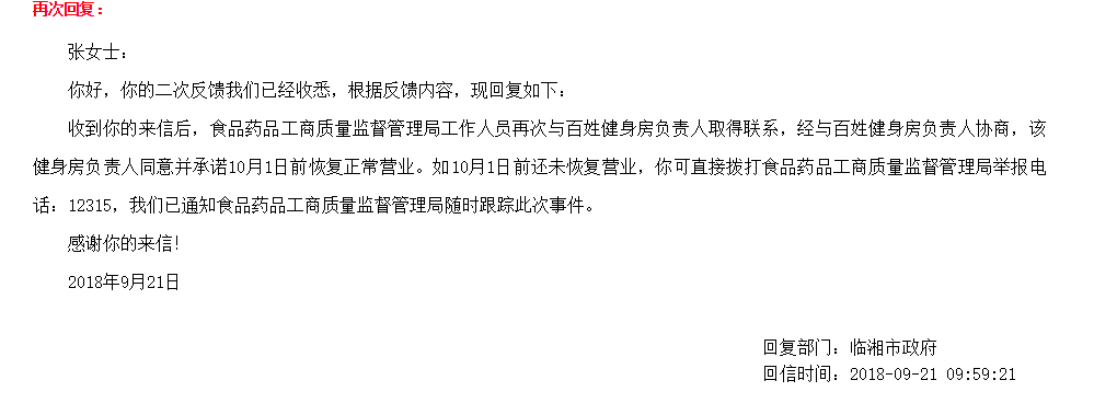 | 回复内容: | 张女士: 您好!您的来信我们已经收悉,经调查核实,现回复如下: 受理岳阳百姓健身有限公司消费者投诉后,我市食品药品工商监督管理局党政班子高度重视,迅速组织局消保股、消委办、两反分局、3.15举报中心、长安所负责人进行会商,成立了投诉调查处理工作小组。 经调查核实,岳阳百姓健身有限公司于2016年08月11日成立,住所在湖南省临湘市五尖山(红色乐园旁),是一家自然人投资或控股有限公司,法定代表人是周昀。该公司主要从事健身服务,全民健身科技服务及游泳馆等。 2018年10月18日上午,食品药品工商监督管理局根据《消费者权益保护法》和《工商行政管理部门处理消费者投诉办法》的相关规定,组织111名消费者与岳阳百姓健身有限公司的委托人进行了调解。在调解过程中,食品药品工商监督管理局充分听取了当事双方的陈述意见,百姓健身公司委托人称:给三至五个工作日的时间,公司将开门继续经营,十五天后愿意退预付卡的可以退卡。消费者认为,百姓健身公司已经表态承诺几次了,是一个不讲诚信的公司,不相信会退卡,如果百姓健身公司有诚意,三天之内退卡。经过近三个小时的调解,双方无法达成一致意见。食品药品工商监督管理局依据《工商行政管理部门处理消费者投诉办法》的规定,决定终止调解。建议您与其他消费者一起共同向人民法院提起诉讼。 特此回复。 2018年10月19日 |