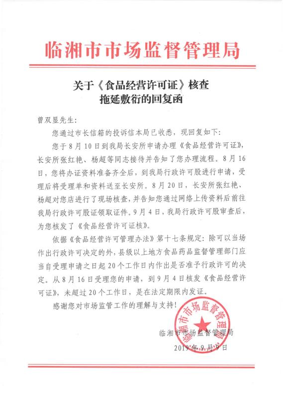 尊敬的临湘市政府领导,我在临湘市药品食品监督局申请了《食品经营许可证》的办理,并于2019年8月18日获得了核查受理通知。但时至今日,核查小组依然不闻不问,也无电话通知,核查遥遥无期。期间,我前去问讯,也只留了姓名跟电话号码,但却并无工作进度消息反馈。我要投诉食品药品监督局毫无工作积极性,并希望政府追究其行政责任。其严重不顾人民的利益,毫无为人民服务的精神,实在是让人万分气愤。如果此事不能圆满解决,我将去省级人民政府信访投诉。 |