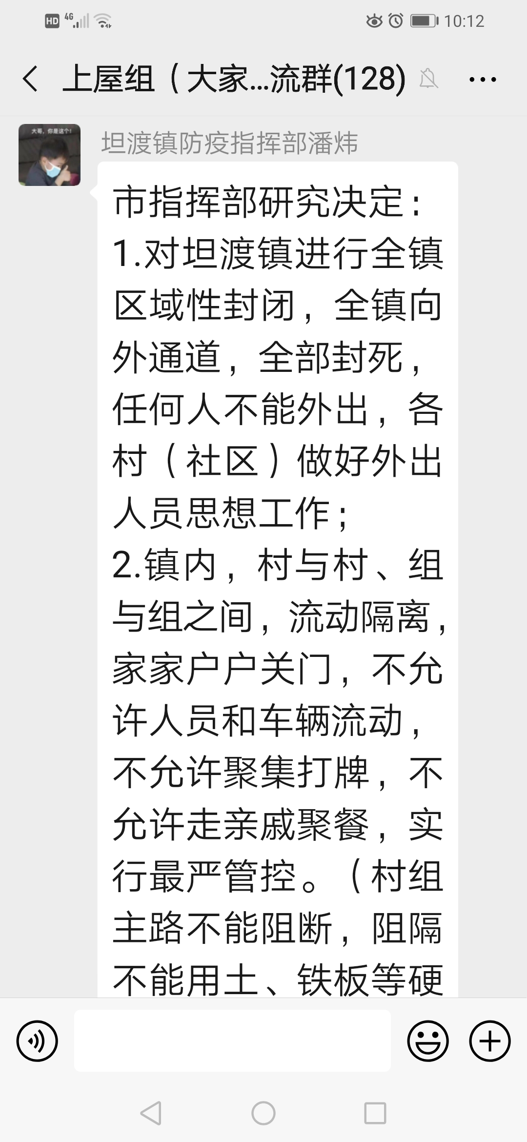 湖南省临湘市坦渡镇,共147.9平方千米,3万人口。因本镇累计发现4例确诊新型冠状肺炎,市防控指挥部口头要求全镇封锁,村组隔断,所有人员禁止外出,该通知未见盖章发文,仅微信群通知。因4人确诊,封死全镇3万人口的外出打工与对外交通。与上级政府岳阳市要求,逐步恢复交通复工复产的发文不符。现本人需回到省会长沙有急事,不用再回临湘市。建议与肺炎病例无任何接触者,政府应该允许离开本镇,不能搞全镇人口一刀切。 |