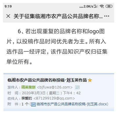 | 回复内容: | 何卫兵先生:您好! 感谢您对临湘市农产品公共品牌征集工作的关注与支持。根据您投诉中反映的问题,我们进行了调查核实。现将有关情况答复如下: 一、农产品公共品牌征集活动的时间条件:您投诉反映,二等奖获奖作品“临农湘品”您女儿也是投稿人,但最终获奖者另有其人,而不是您的女儿。这是因为: 临湘市农产品公共品牌征集启事中明确规定:“若出现重复的品牌名称和logo图标,以投稿作品时间优先者为主”。获奖作者的投稿时间为2020年3月3日16点42分,出现相同名称的情况下,投稿时间优先的稿件将胜出。您在投诉中给出的您女儿的投稿时间是3月5日,在获奖作品的投稿时间之后,不具备获奖条件。