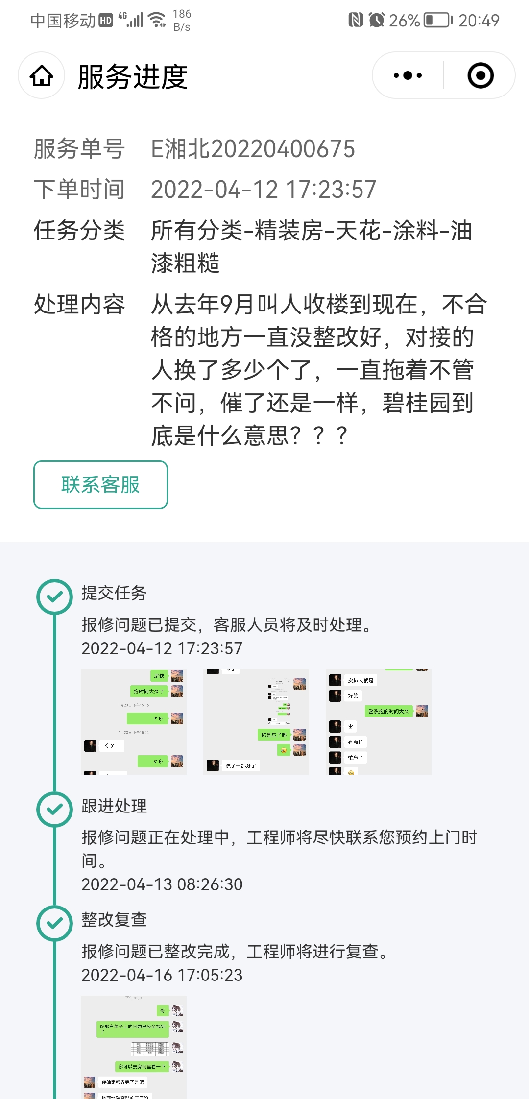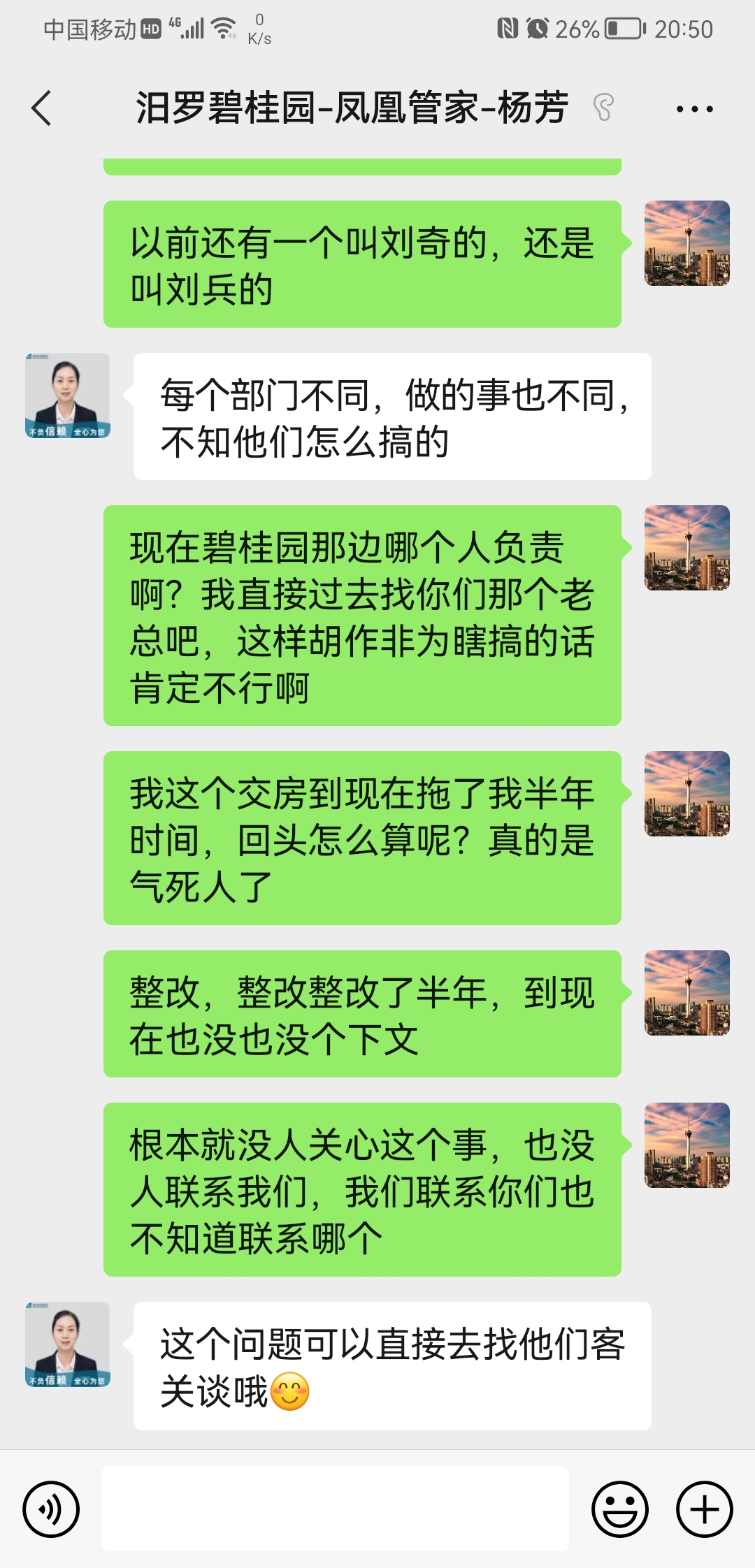 汨罗碧桂园交房质量达不到交房标准,拖延整改,并强制收取物业费! 我于2018年10月购买了汨罗碧桂园的房子,合同交房日期为2021年9月30日前,到期是有通知去收房,我也按时去了,但房子装修质量根本达不到交房标准,只是为了不违约硬着头皮通知交房,后面开发商答应整改后再通知收房,但这个整个时间遥遥无期,一拖再拖,对接人员换了几个,直至今天2022年5月28都没有整改好。今天打算收房算了,不能再被他们耗着浪费时间,毕竟房子是买来住的,各项手续办完,签完字,按完手印,给了我们资料和钥匙,然后被告知需要缴从2021年9月30日至今天的物业费,这让我们不能接受,明明是开发商的房子质量问题,达不到交房标准耽误我们业主的入住时间不说,反而还被要求如果不补缴物业费,就不给房子钥匙,这特别让人气愤,而且工作人员态度差,互相推萎,说物业只按合同交房时间收取物业费,房子质量好坏不关他们的事,想拿钥匙,想进来装修就必须补缴物业费。请政府领导评评理,这钱该缴吗???老百姓活该被压榨吗? 附件1:Screenshot_20220528_204923_com.tencent.mm.jpg 附件2:Screenshot_20220528_205032_com.tencent.mm.jpg |