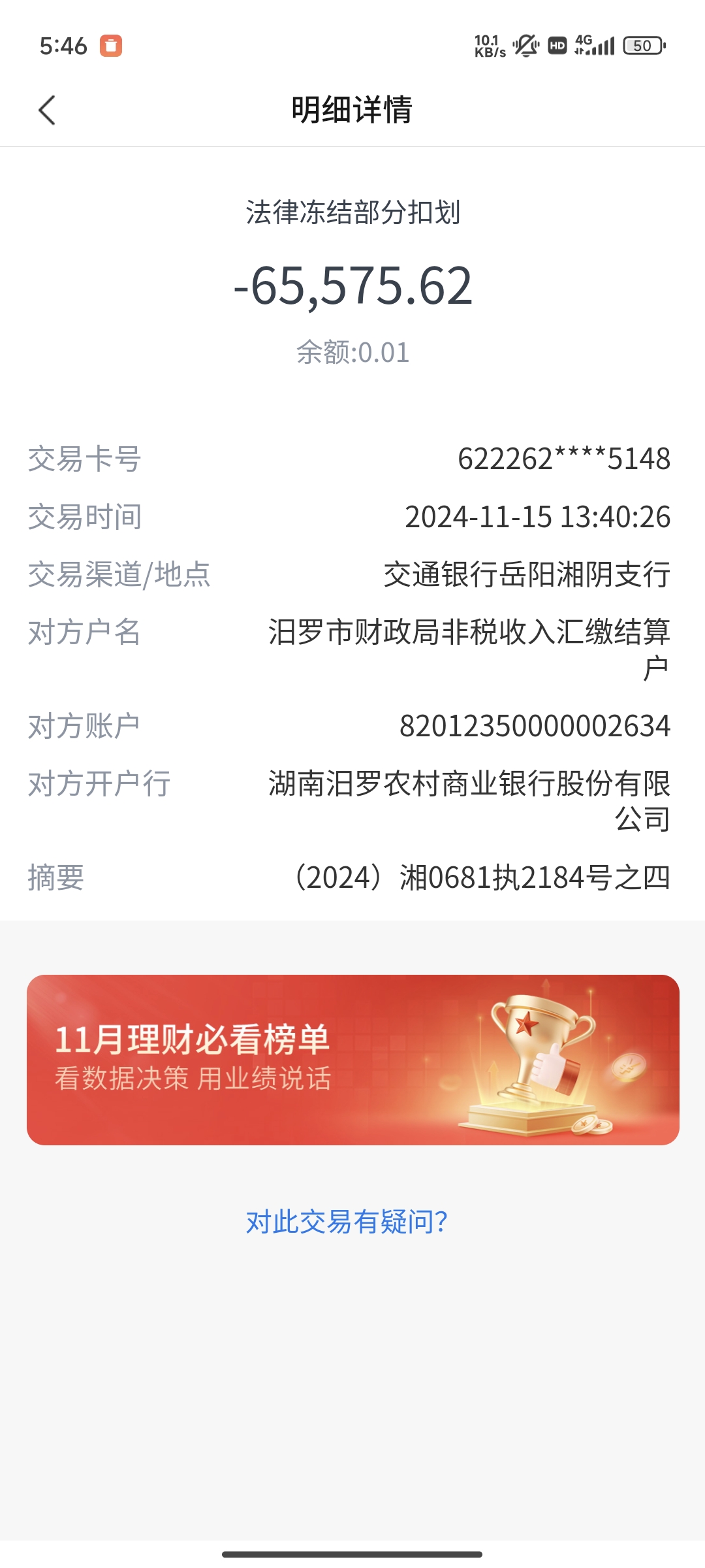 本人交通银行卡:622262734000082**** 户名:顾建,于2024.11.15被汨罗市公安局划扣65575.62,银行卡中冻结元全部为本人合法工资收入,家里父亲严重痛风经常疼得下不了路一直靠药物维持,时不时还要去医院进行手术,卡里都是治病钱,现如今遭冻结,已经对我个人以及家庭造成严重损害。 请问中国公民财产安全在哪里 我非常热爱,敬重我的祖国,祖国实行的政策毋庸置疑都是非常好的。但是这次无故冻结老百姓血汗钱,且各种机关部门人员不作为的事情令我不寒而栗。请求上级部门查处这群害群之马,为老百姓申冤。救救我们老百姓! 我的诉求是尽快归解冻我的银行卡,那是治病钱。 附件1:Screenshot_2024-11-16-17-46-21-450_com.bankcomm.Bankcomm.jpg |