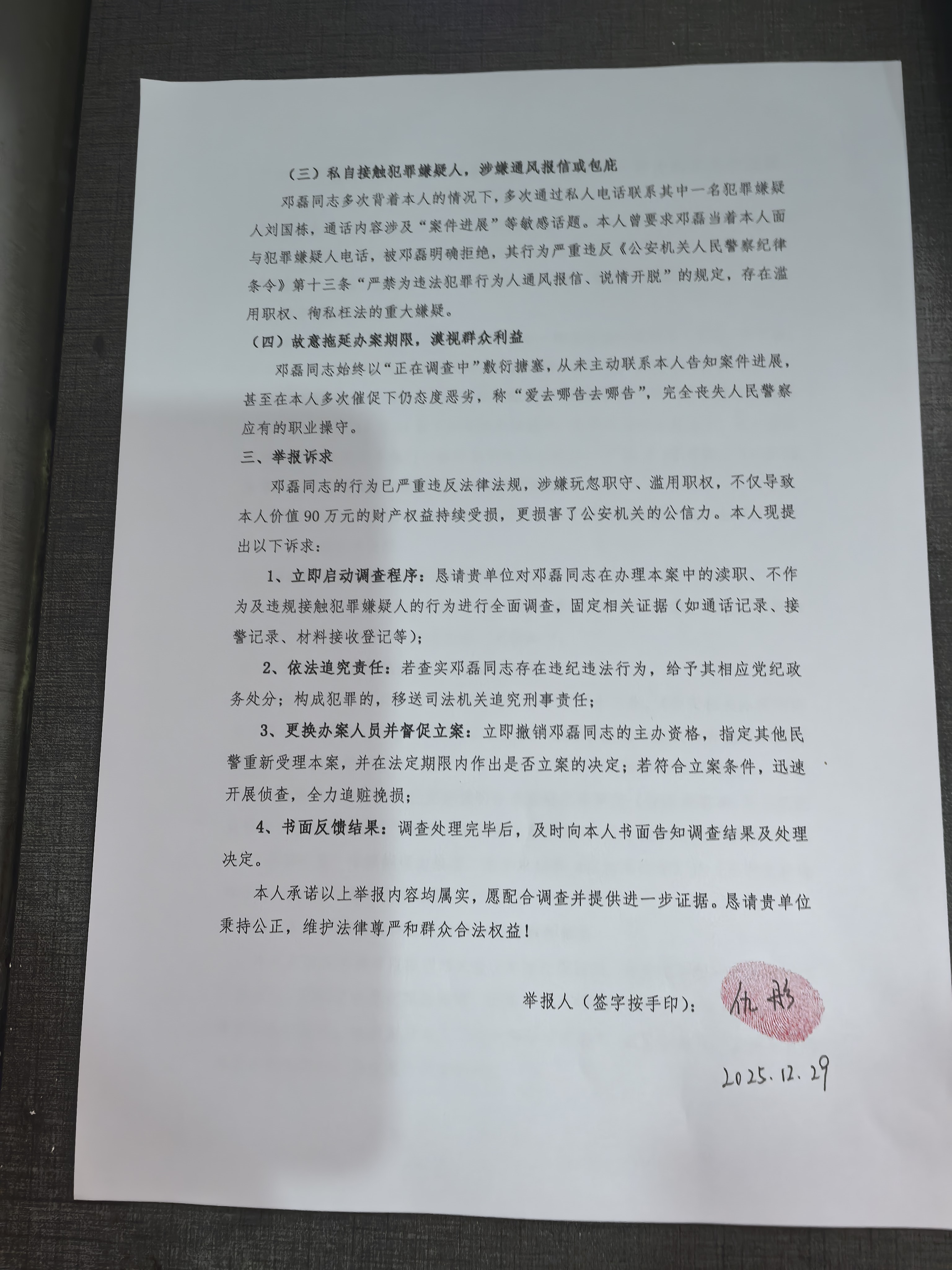 关于邓磊同志在办理车辆被盗案中涉嫌渎职不作为的实名举报信 举报人:仇彤 ,性别:女,身份证号:43068119920514094X,联系电话:13077106633,住址:湖南省汨罗市大众南路荷花塘社区86号。 被举报人:邓磊,汨罗市公安局归义派出所民警,警号:075813。 一、基本案情及报案经过 本人于2025年12月21日晚将借用的一辆灰色保时捷轿车(车主:李伊焱,车牌号:湘A970FV,车辆识别代码:WPQAA2981KS261344 ,购买价格约90万元,有购车发票、行驶证为证)停放于我家院子内(湖南省汨罗市大众南路荷花塘社区86号)。本人12月24日下午发现车辆被盗,经调取监控录像显示,系5名犯罪嫌疑人结伙撬开车门、破坏车辆防盗系统后,于12月23日晚上11点29分驾车逃离现场(监控视频已刻录光盘并提交)。 2025年12月24日下午,本人向汨罗市归义派出所报案,案件由邓磊同志作为主办民警负责受理。 二、邓磊同志涉嫌渎职不作为的具体事实 自报案以来,邓磊同志在处理本案过程中存在多项违反法律法规及工作纪律的行为,严重损害当事人合法权益,具体如下: (一)无正当理由拒绝立案,违反法定职责 根据《中华人民共和国刑事诉讼法》第一百一十二条、《公安机关办理刑事案件程序规定》第一百七十八条,公安机关对报案材料经审查认为有犯罪事实需要追究刑事责任的,应当立案。本案中,本人提交了车辆被盗的监控视频、购车凭证、报案回执等材料,已充分证明存在盗窃犯罪事实(涉案金额80万元已达盗窃罪“数额特别巨大”标准,依法应立案侦查)。但邓磊同志以“需进一步核实”“证据不足”等模糊理由推诿,至今未出具《立案通知书》或《不予立案通知书》,公然拒绝履行立案职责。 (二)拒不接收关键证据材料,阻碍案件侦查 本人先后3次携带监控视频光盘、车辆权属证明、被盗现场照片等关键证据到派出所,明确要求提交邓磊同志,但其均以“存在经济纠纷”“不是刑事案件”等借口拒绝接收,甚至要求本人“自己保管好材料”。截至举报日,上述证据均未录入案件卷宗,导致案件侦查停滞。 (三)私自接触犯罪嫌疑人,涉嫌通风报信或包庇 邓磊同志多次背着本人的情况下,多次通过私人电话联系其中一名犯罪嫌疑人刘国栋,通话内容涉及“案件进展”等敏感话题。本人曾要求邓磊当着本人面与犯罪嫌疑人电话,被邓磊明确拒绝,其行为严重违反《公安机关人民警察纪律条令》第十三条“严禁为违法犯罪行为人通风报信、说情开脱”的规定,存在滥用职权、徇私枉法的重大嫌疑。 (四)故意拖延办案期限,漠视群众利益 邓磊同志始终以“正在调查中”敷衍搪塞,从未主动联系本人告知案件进展,甚至在本人多次催促下仍态度恶劣,称“爱去哪告去哪告”,完全丧失人民警察应有的职业操守。 三、举报诉求 邓磊同志的行为已严重违反法律法规,涉嫌玩忽职守、滥用职权,不仅导致本人价值90万元的财产权益持续受损,更损害了公安机关的公信力。本人现提出以下诉求: 1、立即启动调查程序:恳请贵单位对邓磊同志在办理本案中的渎职、不作为及违规接触犯罪嫌疑人的行为进行全面调查,固定相关证据(如通话记录、接警记录、材料接收登记等); 2、依法追究责任:若查实邓磊同志存在违纪违法行为,给予其相应党纪政务处分;构成犯罪的,移送司法机关追究刑事责任; 3、更换办案人员并督促立案:立即撤销邓磊同志的主办资格,指定其他民警重新受理本案,并在法定期限内作出是否立案的决定;若符合立案条件,迅速开展侦查,全力追赃挽损; 4、书面反馈结果:调查处理完毕后,及时向本人书面告知调查结果及处理决定。 本人承诺以上举报内容均属实,愿配合调查并提供进一步证据。恳请贵单位秉持公正,维护法律尊严和群众合法权益! 附件1:微信图片_20251229162525_3_4.jpg 附件2:微信图片_20251229162523_2_4.jpg 附件3:微信图片_20251229163952_4_4.jpg 附件4:微信图片_20251229163953_5_4.jpg |