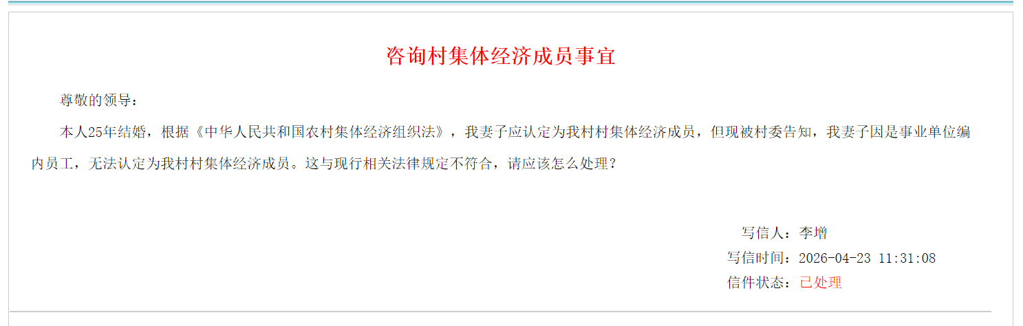 | 回复内容: | 尊敬的李先生: 您好!针对您反映的妻子(事业单位在编人员)成员资格认定问题,现回复如下: 根据中共汨罗市委办公室《关于印发<汨罗市农村集体经济组织成员身份确认指导意见(试行)>的通知》(汨办发〔2019〕84号)规定,经人力资源和社保部门办理正式招工录用手续的事业单位现职工作人员,不具备本村集体经济组织成员资格。您妻子属事业单位编内员工,按此文件暂不能认定为我镇农村集体经济组织成员。 感谢您的理解与支持。 古培镇人民政府 2026年4月29日 |