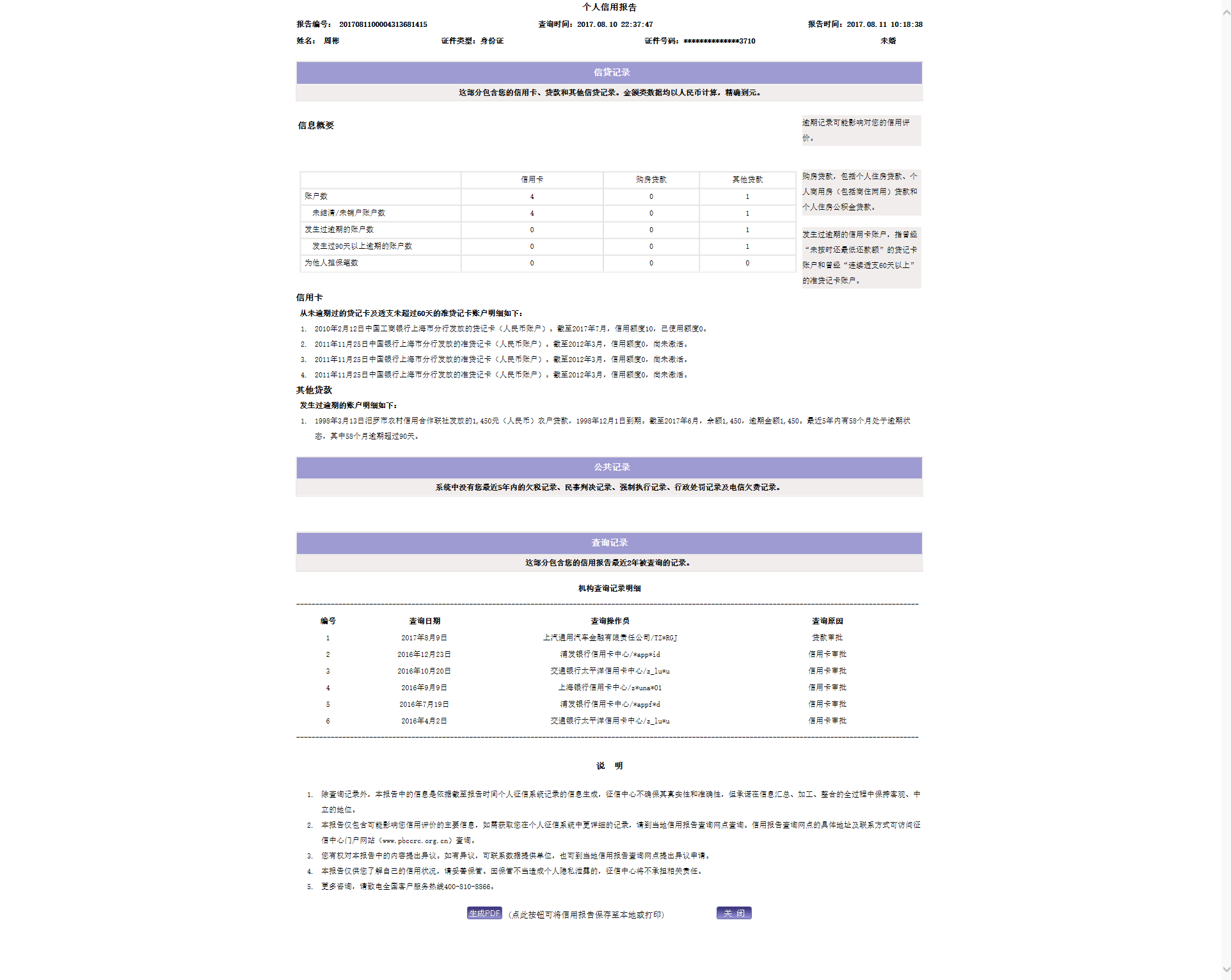 本条附件为我的信用报告 我叫周彬,男28岁,湖南省岳阳市汨罗市李家锻镇画眉村人,因前段时间买车贷款没有通过,车行销售说我的征信没有通过,介意我查一下我的征信报告,我8月11日查了,觉得太奇葩了,说我在1998年3月13日贷款1450元,试问一下一个九岁的孩子可以贷到款么,而且这么久了一直都留在那里,没有帮我销掉 ,我还联系了0730-5234067的信用社电话,一个姓杨的人接我的电话,说一个星期最多二十天帮我解决,后面我再打电话给他有更我说要一两个月才解决,这本来就是信用社的失误影响了我,他们还爱理不理,我希望有关部门帮助协商解决我的问题,并赔偿我的名誉和信誉费。 附件1:个人信用报告_副本.jpg |