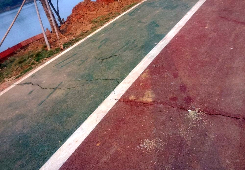 竣工应该还不到三个月吧? 湖滨圣安寺附近的彩色沥青路怎么就开裂破损成那样了!(别跟我们说这是大卡车压的哦)