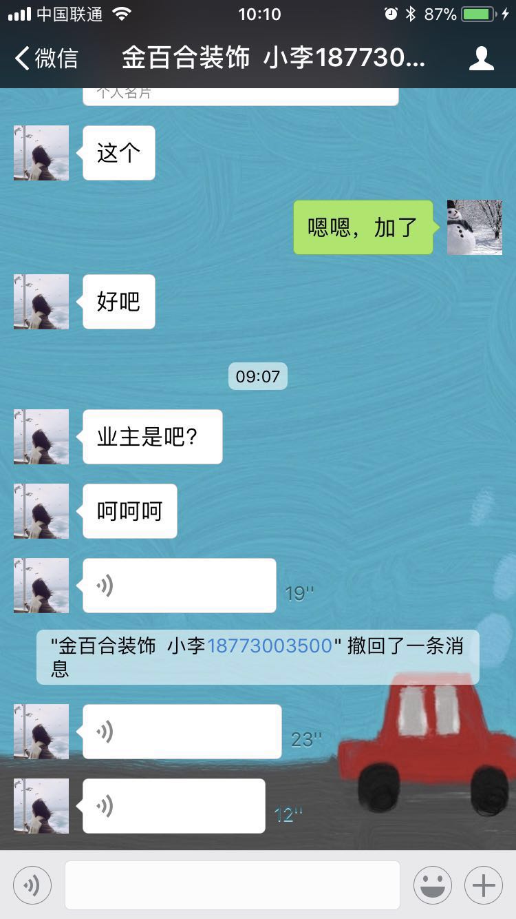 尊敬的市长、住建局领导:我是一名普通的岳阳市民,因家中新房急需装修,在网上联系了几个装修公司,其中就包括今天我要投诉的金百合装饰。金百合装饰地处岳阳市气象站对面、岳阳兴燕4s店旁边,我与他们公司的员工于微信上取得了联系。2018年3月23日下午五时许,本人应邀前往该公司实地了解情况,交流了解一小时后,我就离开了该公司。一两天后该公司员工催促我去量房,当时我不在岳阳本地,所以就跟她说了不去,后来这名员工就在微信上对我辱骂,说我是同行探子,去打探情报的,还对我进行人身攻击,对我父母进行辱骂。她的这种行为,严重影响了我的生活,导致我上班心神不宁,影响工作。该公司员工素质低下,对消费者的心灵构成了不可磨灭的影响。