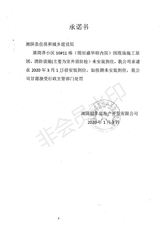 湘阴银丰房地产开发有限公司因恒盛华府项目正在施工中,其消防设施尚未完善、小区消防设施设备缺失后,该房地产公司当即作出承诺将于2020年3月1日前完成整改(见承诺书)。整改措施包括1、消防通道确保畅通;2室外消火栓及灭火器按设计图纸安装到位。同时,我局也将继续关注该情况,督促该公司将消防设施设备按时按要求整改到位。