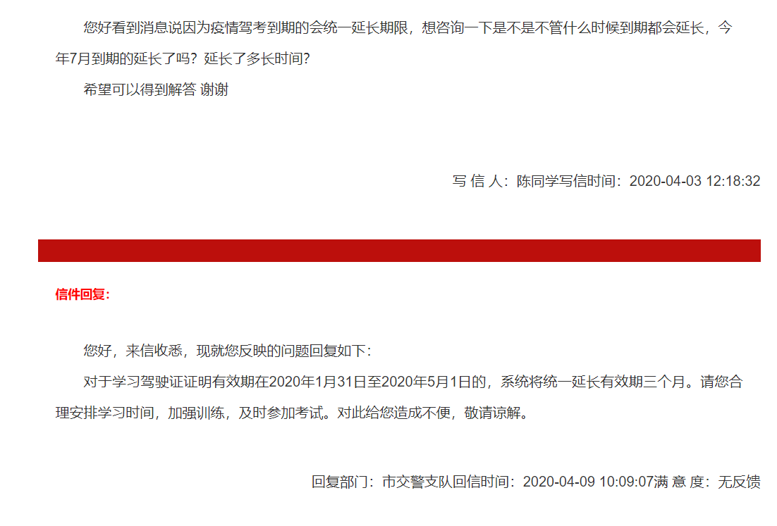 我就关与驾考证明有效期的问题向您提一条建议。因为因为疫情原因驾考中心停考了一段时间。现已恢复考试,驾考证明有效期在1月13号至5月1号的学员的有效期延长3个月(交警支队关于延期的回复见附件)。这对有效期在5月1号以后且临近5月1号的学员造成不便,甚至还没预约上考试就已过期。疫情期间大家都因此耽误了驾考学习考试时间,却只有部分人考试有效期延期。所以我建议延长所有在疫情之前开始计算有效期的学员。